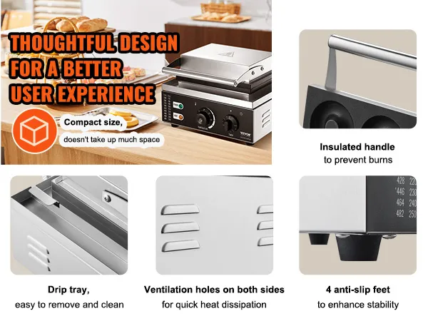 Benutzerfreundliches Design: Unsere kommerzielle Waffel-Donut-Maschine verfügt über einen hitzebeständigen Edelstahlgriff, der Verbrennungen vorbeugt. Eine Auffangschale, die sich zum Reinigen leicht abnehmen lässt. Seitliche Belüftungsöffnungen für eine schnellere Abkühlung sorgen dafür, dass die Maschine effizient arbeitet. Rutschfeste Füße sorgen für Stabilität und Benutzerfreundlichkeit des Donut-Makers.