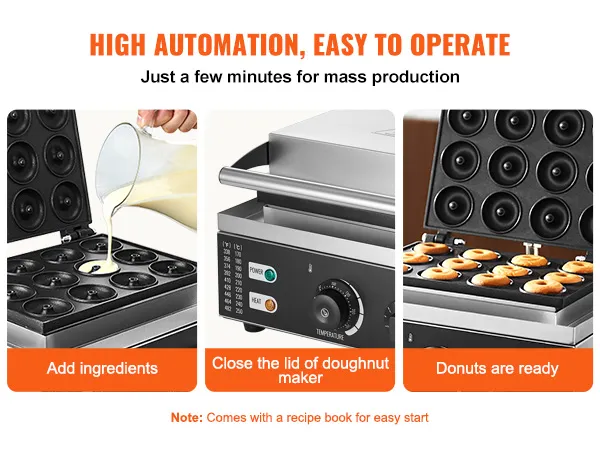 Diese handelsübliche Waffel-Donut-Maschine ist einfach zu bedienen und wird mit einem Rezeptbuch geliefert, mit dem Sie mühelos leckere Donuts herstellen können.