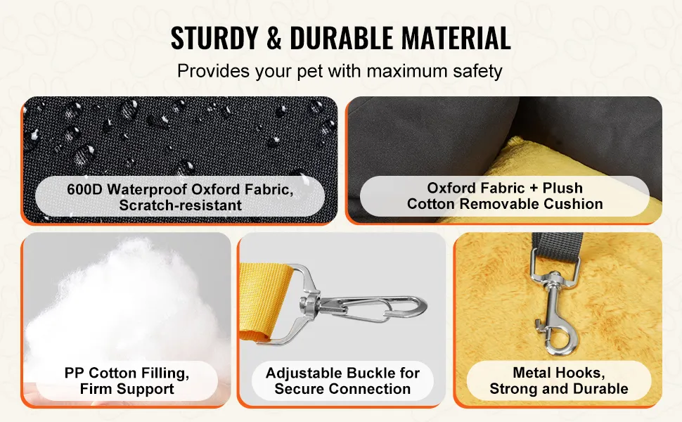 Hergestellt aus wasserdichtem Oxford-Gewebe und gefüllt mit PP-Baumwolle für einen stabilen, verschleißfesten Sitz. Dieser Hunde-Autositz erhöht Ihr Haustier und reduziert Reiseängste.