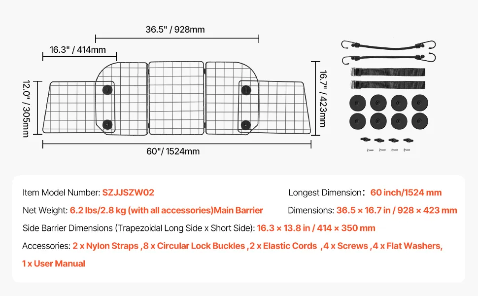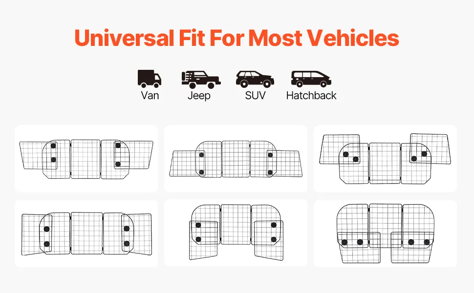 Universelle Passform & Einstellbarkeit: Die Hauptplatte unserer Hundebarriere fürs Auto misst 928 x 423 mm (36,5 x 16,7 Zoll), die Seitenplatten messen 414 x 350 mm (16,3 x 13,8 Zoll) und können bis auf 1524 mm (60 Zoll) ausgezogen werden. Sie kann mit verschiedenen Konfigurationen an verschiedene Fahrzeugmodelle angepasst werden, darunter SUVs, Vans, Jeeps und Schräghecklimousinen (nur hintere Kopfstütze)