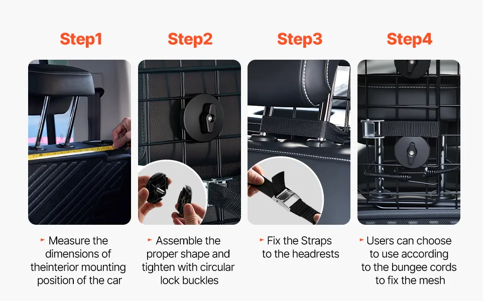 Die Befestigung erfolgt mithilfe von Ringschrauben und Nylonbändern an den Kopfstützen der Rücksitze. Für zusätzliche Stabilität wird ein elastisches Seil mitgeliefert, das dafür sorgt, dass die Barriere fest an ihrem Platz bleibt.