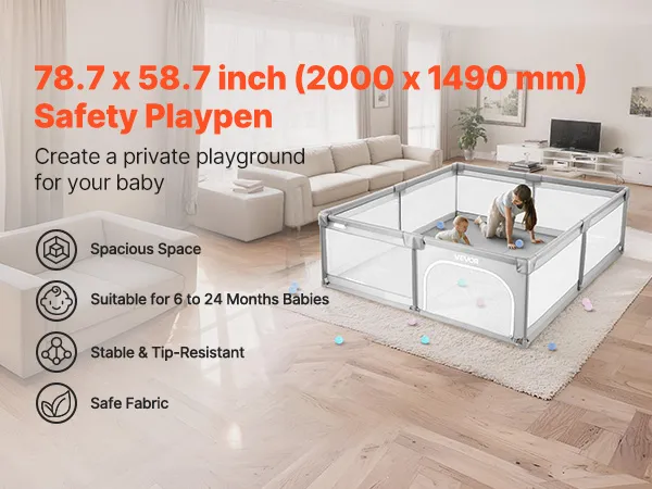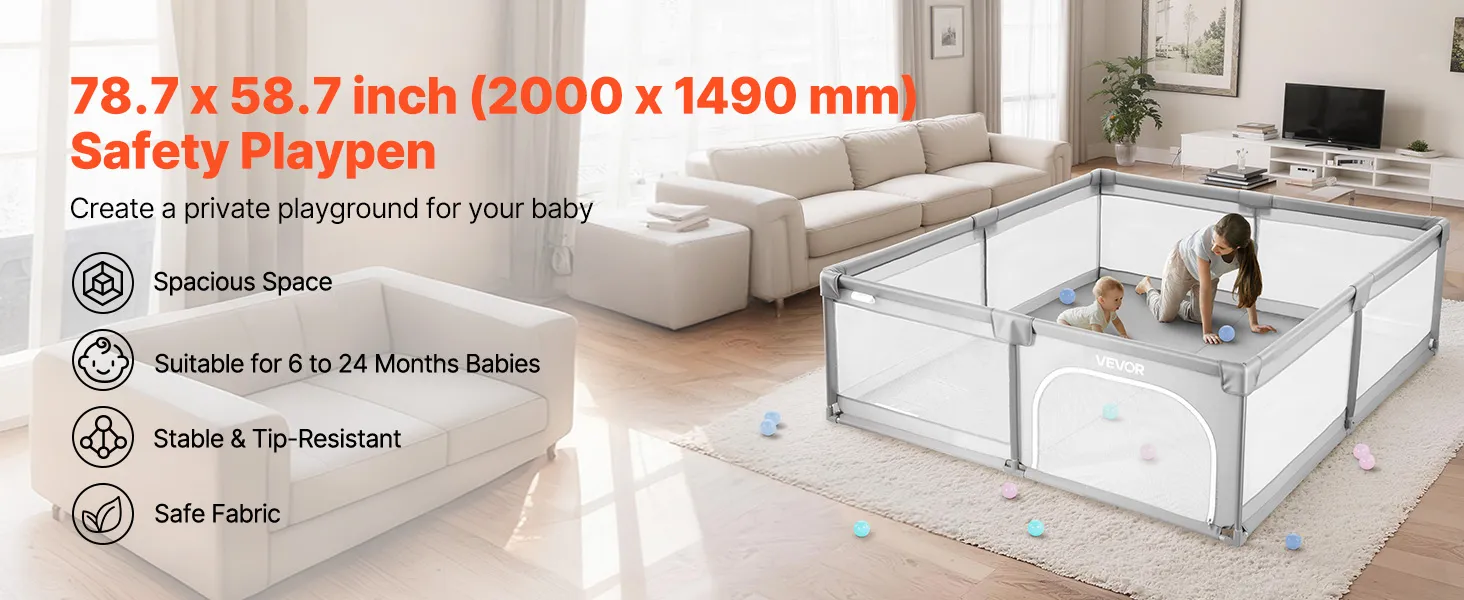 Schaffen Sie mit dem großen VEVOR-Laufstall (Innenmaß 2000 x 1490 mm) einen sicheren und unterhaltsamen Spielbereich für Ihr Kind. Dieser geräumige Spielplatz ist für Kleinkinder im Alter von 6–24 Monaten konzipiert und eignet sich perfekt, um Ihrem Kind das Laufen zu lernen, zu spielen, die Welt zu erkunden und die Eltern-Kind-Beziehung zu genießen.
