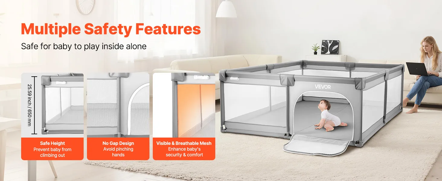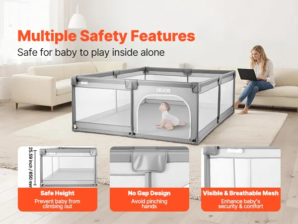 Lassen Sie Ihr Kleines sicher spielen, während Sie beruhigt sind. Dieser Laufstall für Kleinkinder verfügt über eine wissenschaftlich entwickelte Höhe, um ein Herausklettern des Babys zu verhindern, eine lückenlose Struktur, um eingeklemmte Finger zu vermeiden, und ein atmungsaktives Netz für optimale Luftzirkulation und Sichtbarkeit. Bitte beachten Sie: Die Spielmatte ist nicht im Lieferumfang enthalten, bitte separat besorgen.