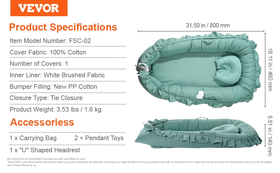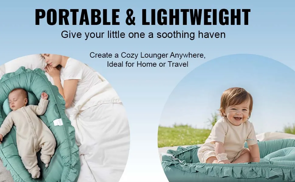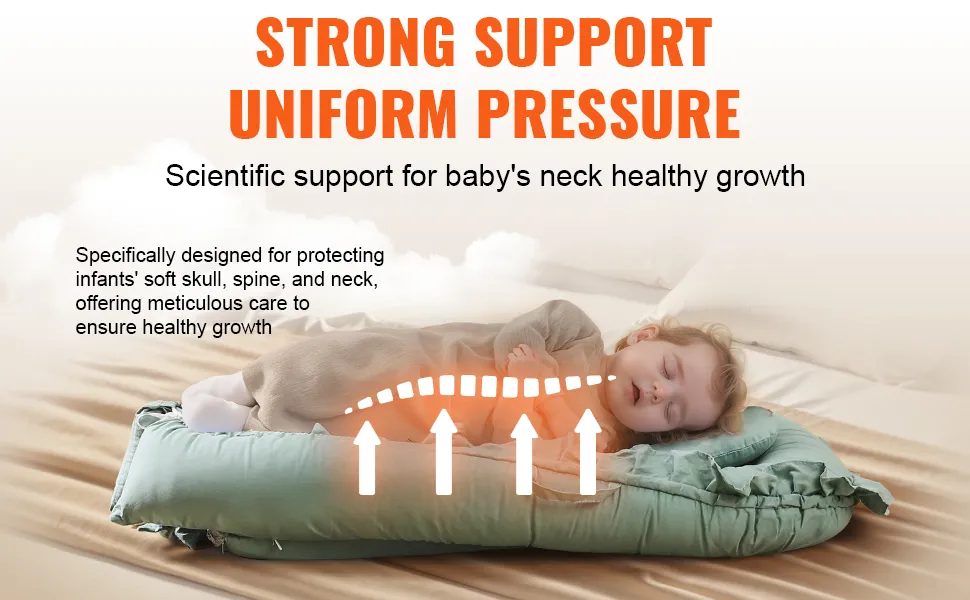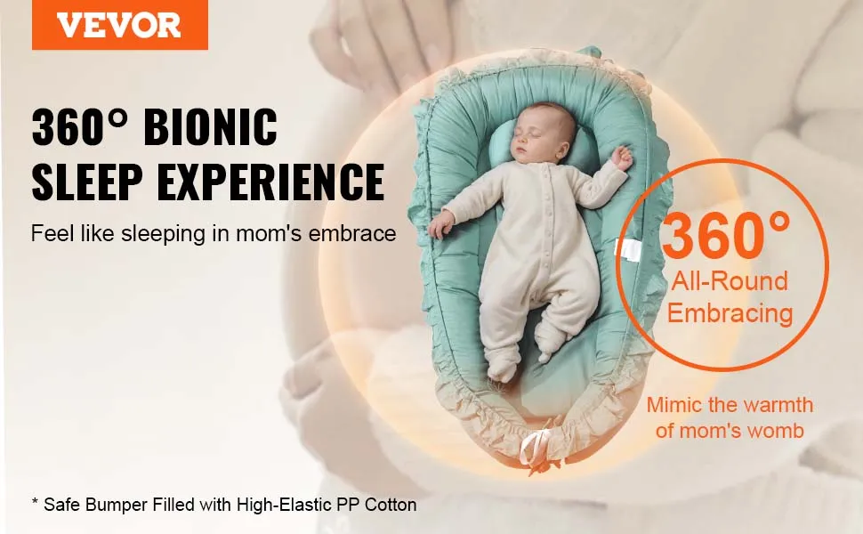 Die VEVOR-Babyliege verfügt über ein doppelseitiges Design aus 100 % Baumwollstoff und bietet dem Baby eine weiche und sanfte Berührung. Die U-förmige Kopfstütze, die 360°-Umarmung und die sicheren Stoßfänger imitieren die Wärme und Sicherheit der Umarmung der Mutter.