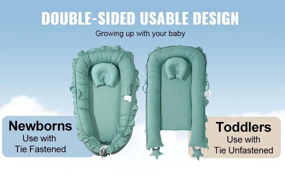 Zweiseitige Verwendbarkeit: Diese Babyliege verfügt über ein doppelseitiges Design, sodass Sie die Seiten bei Bedarf problemlos wechseln können. Beide Seiten bieten Ihrem Baby den gleichen Komfort, wodurch die Lebensdauer der Babynestliege verlängert und die Notwendigkeit häufiger Reinigung verringert wird. So wird die Elternschaft bequemer und problemloser.
