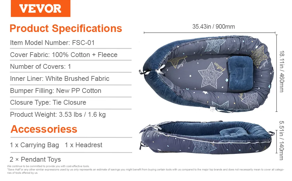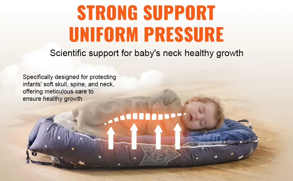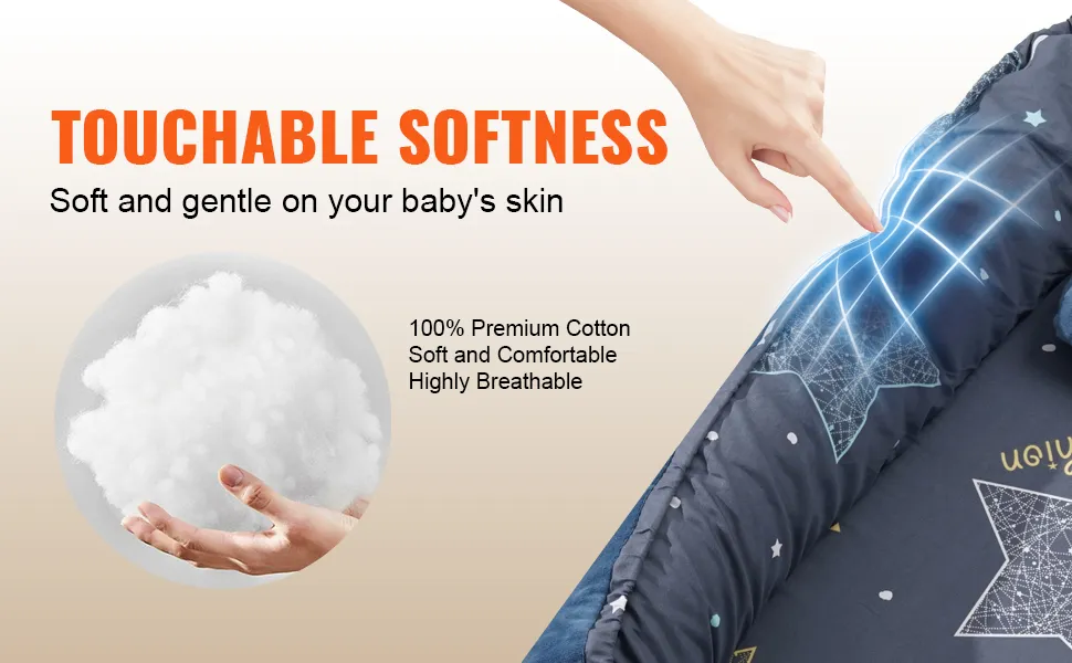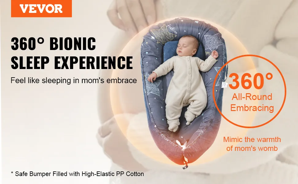 Die VEVOR-Babyliege verfügt über ein doppelseitiges Design aus 100 % Baumwollstoff und bietet dem Baby eine weiche und sanfte Berührung. Die weiche Kopfstütze, die 360°-Umarmung und die sicheren Stoßfänger imitieren die Wärme und Sicherheit der Umarmung der Mutter.