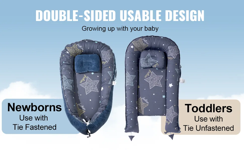 Zweiseitige Verwendbarkeit: Diese Babyliege verfügt über ein doppelseitiges Design, sodass Sie die Seiten bei Bedarf problemlos wechseln können. Beide Seiten bieten Ihrem Baby den gleichen Komfort, wodurch die Lebensdauer der Babynestliege verlängert und die Notwendigkeit häufiger Reinigung verringert wird. So wird die Elternschaft bequemer und problemloser.