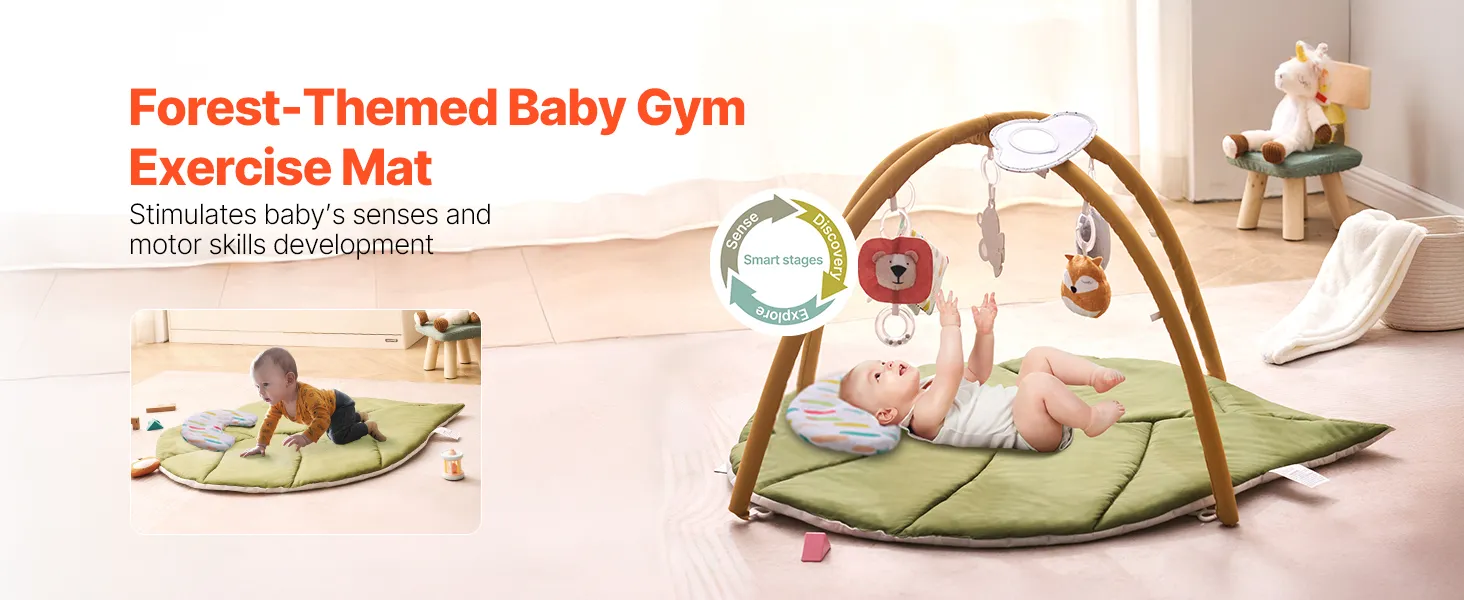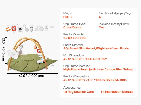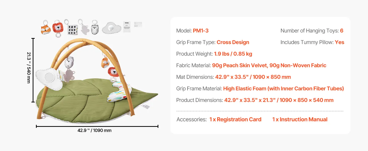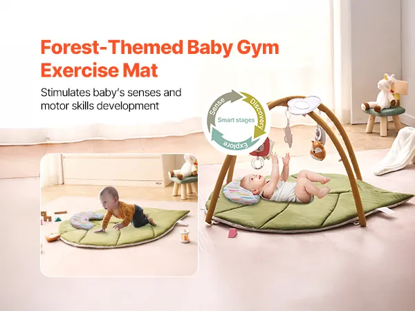 Unsere blattförmige Baby-Spielmatte ist für die Entwicklung der sensorischen und motorischen Fähigkeiten Ihres Babys unverzichtbar. Die 42,9 x 33,5 Zoll / 1090 x 850 mm große Matte mit 6 sensorischen Spielzeugen ist ideal für Babys im kognitiven Stadium. Sie hilft ihnen, die Welt zu spüren, zu entdecken und zu erkunden, und fördert so kognitive Fähigkeiten und Wachstum.