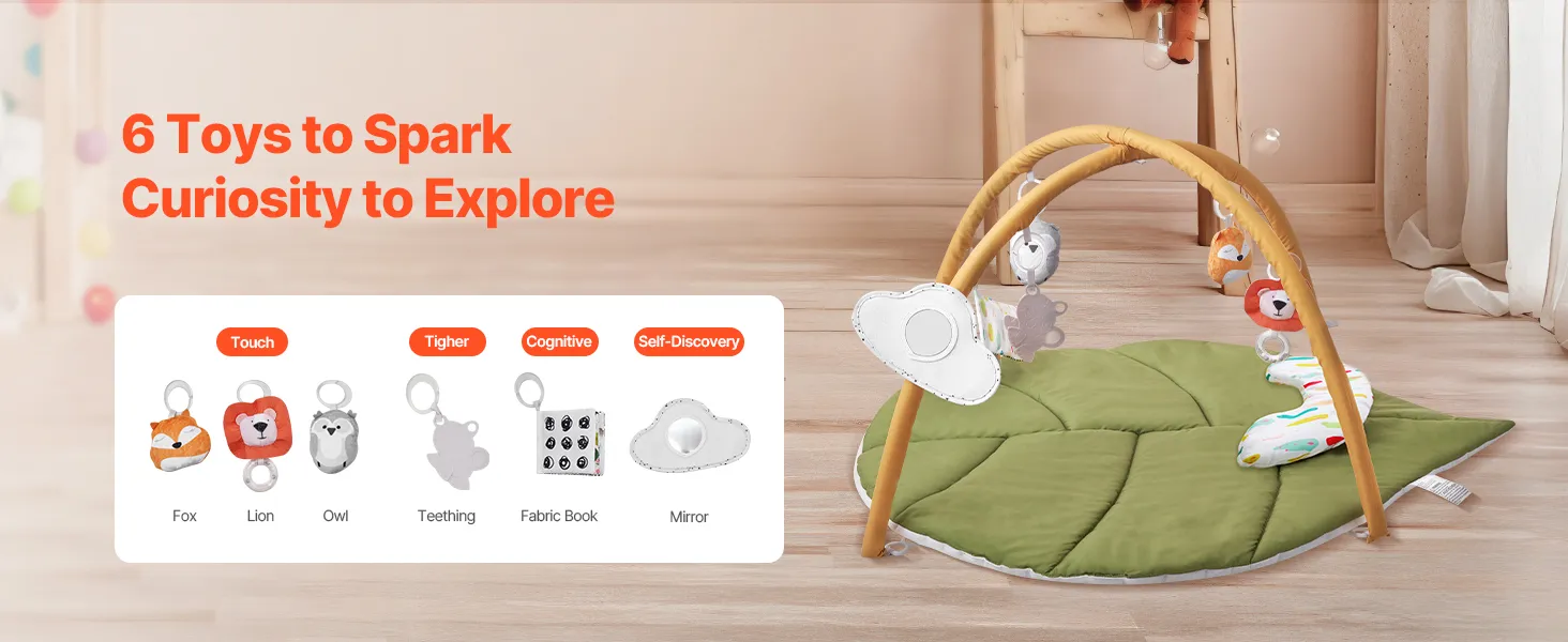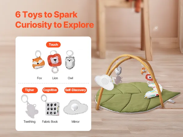 6 sensorische Spielzeuge: Unsere Spielmatte für die Bauchlage enthält 6 abnehmbare hängende Spielzeuge, die die allgemeine sensorische Entwicklung und die Hand-Auge-Koordination des Babys stimulieren. 3 Tierspielzeuge (Eule, Löwe, Fuchs) verbessern die taktile Erkundung, das Tigerspielzeug unterstützt das Zahnen, der Selbstentdeckungsspiegel fördert die Sehfähigkeit und das Stoffbuch fördert die kognitive Entwicklung.