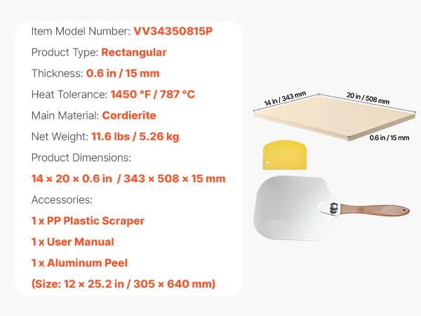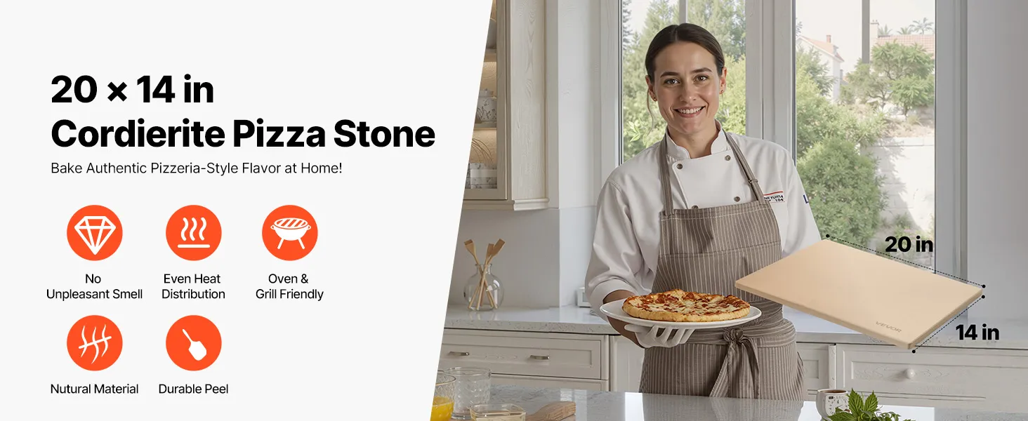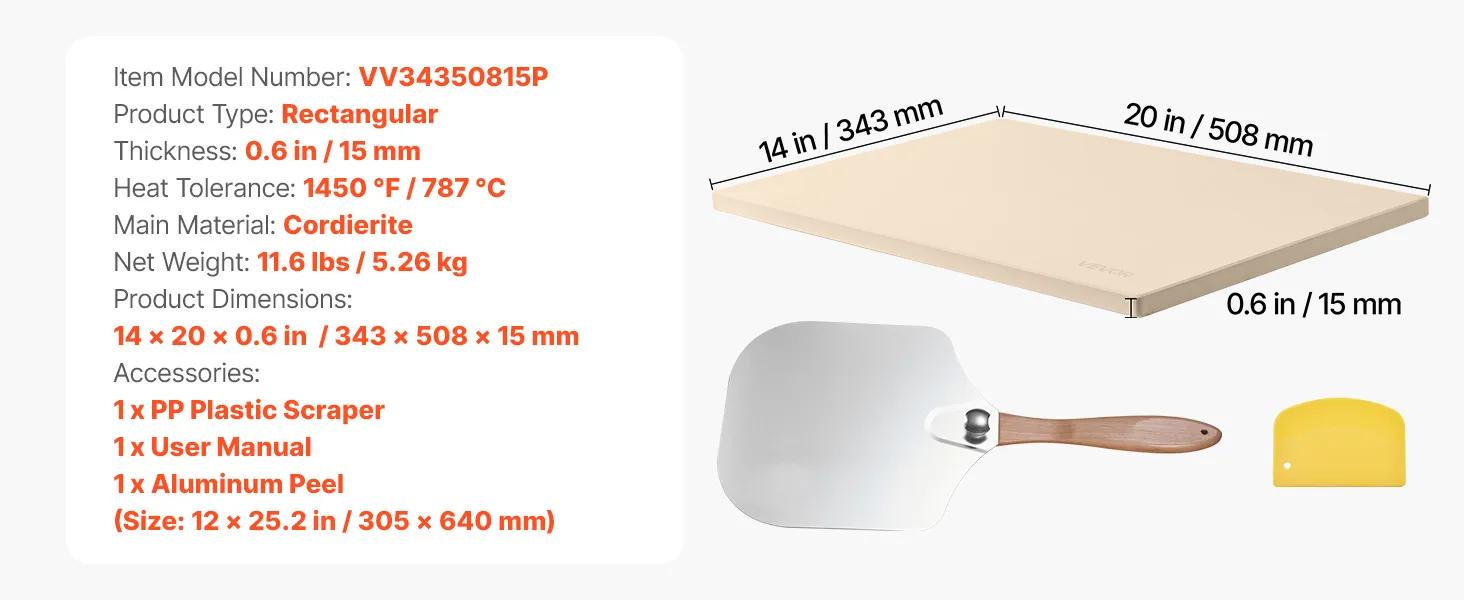 VEVOR Pizzastein Backstein 508 x 355 mm, rechteckiger Cordierit-Pizzastein, extra große Steinplatte mit Schaber & Schaufel, 1,5 cm dick, hitzebeständig, für Küchenofen Brotbacken Pizzabacken