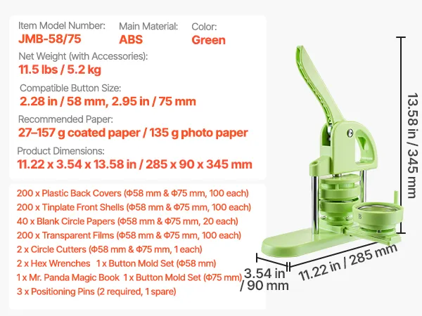 2 in 1 Design: Unsere Buttonmaschine umfasst 2,28 und 2,95 Zoll (58 / 75 mm) große Buttonteile. Sie können Anstecker in verschiedenen Größen erstellen und so das häufige Problem der Größenabweichung beim Materialwechsel lösen. Das sorgt für ein besseres Benutzererlebnis und mehr kreative Flexibilität