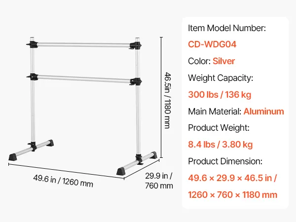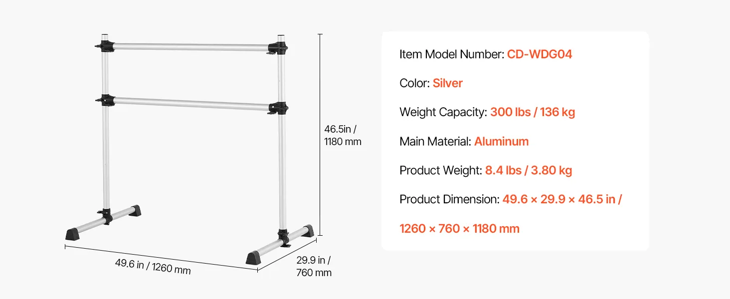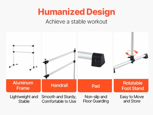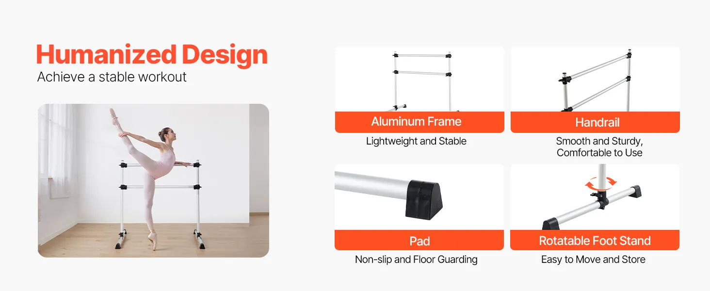 Hochwertiges Material: Die Ballettstange besteht aus einem Aluminiumrahmen mit pulverbeschichteter Oberfläche sowie hochwertigen Befestigungselementen und ist bis zu 300 lbs (136 kg) belastbar. Sie ist mit rutschfesten Fußpolstern ausgestattet, die für Stabilität beim Dehnen und Kräftigen der Rumpfmuskulatur sorgen
