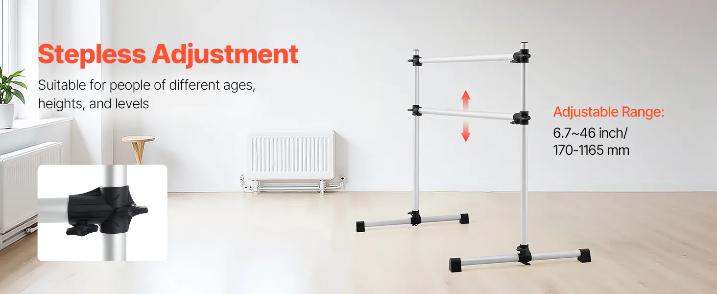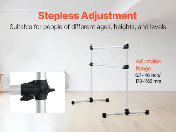 Die höhenverstellbare Tanzstange verfügt über zwei 1219 mm lange Stangen, deren Höhe von unten nach oben verstellbar ist. Verstellbereich: 170-1165 mm. Drehen Sie einfach den Knopf, um die Höhe Ihren Bedürfnissen anzupassen.