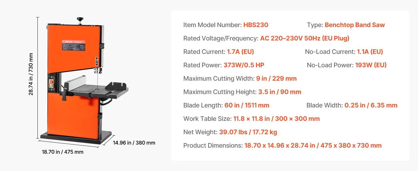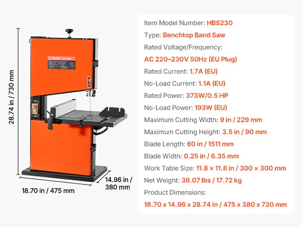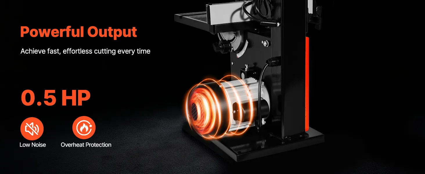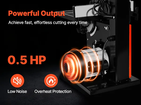 Starke Schnittleistung: Ausgestattet mit einem 0,5 PS/373 W starken Motor und einem 1511 mm langen Sägeblatt, schneidet diese Bandsäge für Holzbearbeitung bis zu 90 mm Höhe und 229 mm Breite. Profitieren Sie von glatten, sauberen und effizienten Schnitten in Hartholz, Weichholz und mehr.