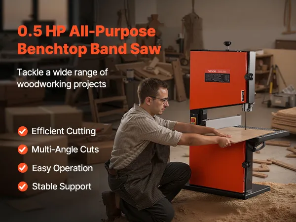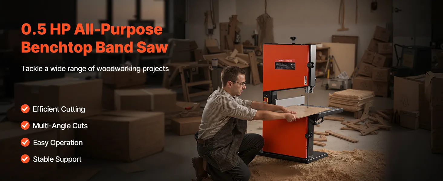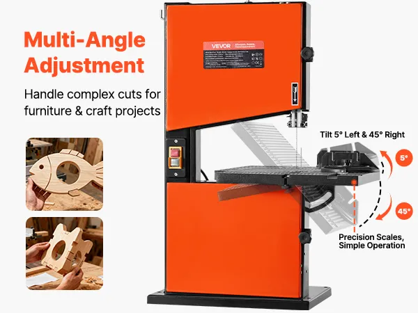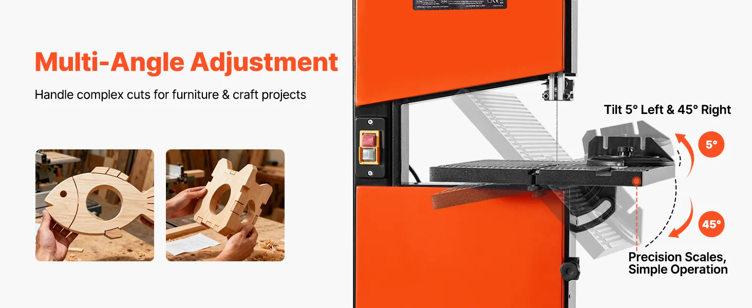 Präzision in jedem Winkel: Neigen Sie den Tisch um 5° nach links und 45° nach rechts, um gerade Linien, Kurven und Gehrungsschnitte mühelos auszuführen. Diese Tischbandsäge ist für präzise Ergebnisse bei komplexen Holzbearbeitungsprojekten konzipiert.