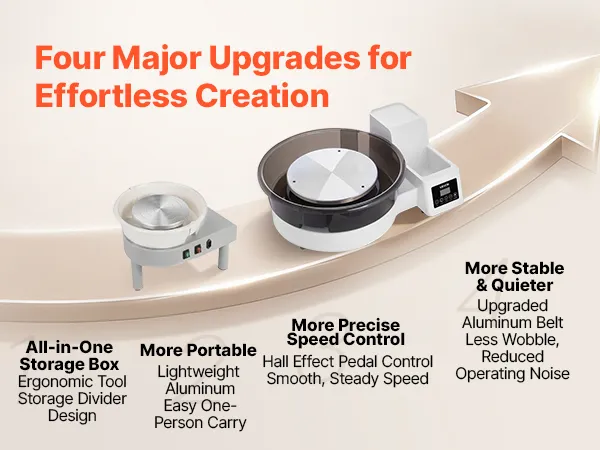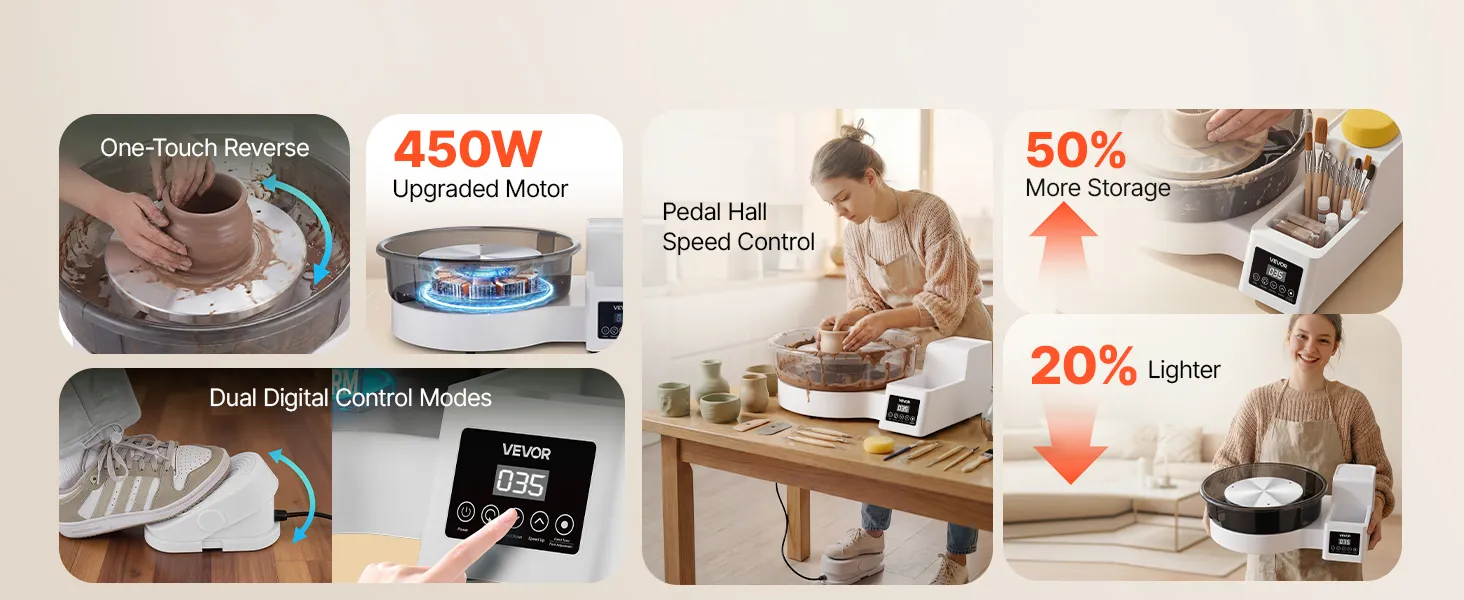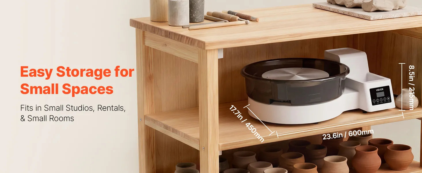 • Integrierte Werkzeugaufbewahrung: Unsere elektrische Töpferscheibe unterstützt konzentriertes Arbeiten ohne Ablenkung. Die zweilagige Aufbewahrungsbox auf der rechten Seite bietet Platz für Schneidwerkzeuge, Farben und weitere wichtige Utensilien in Griffweite und sorgt für Ordnung sowie einen reibungslosen, ungestörten Arbeitsablauf