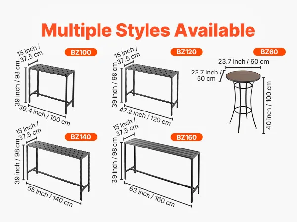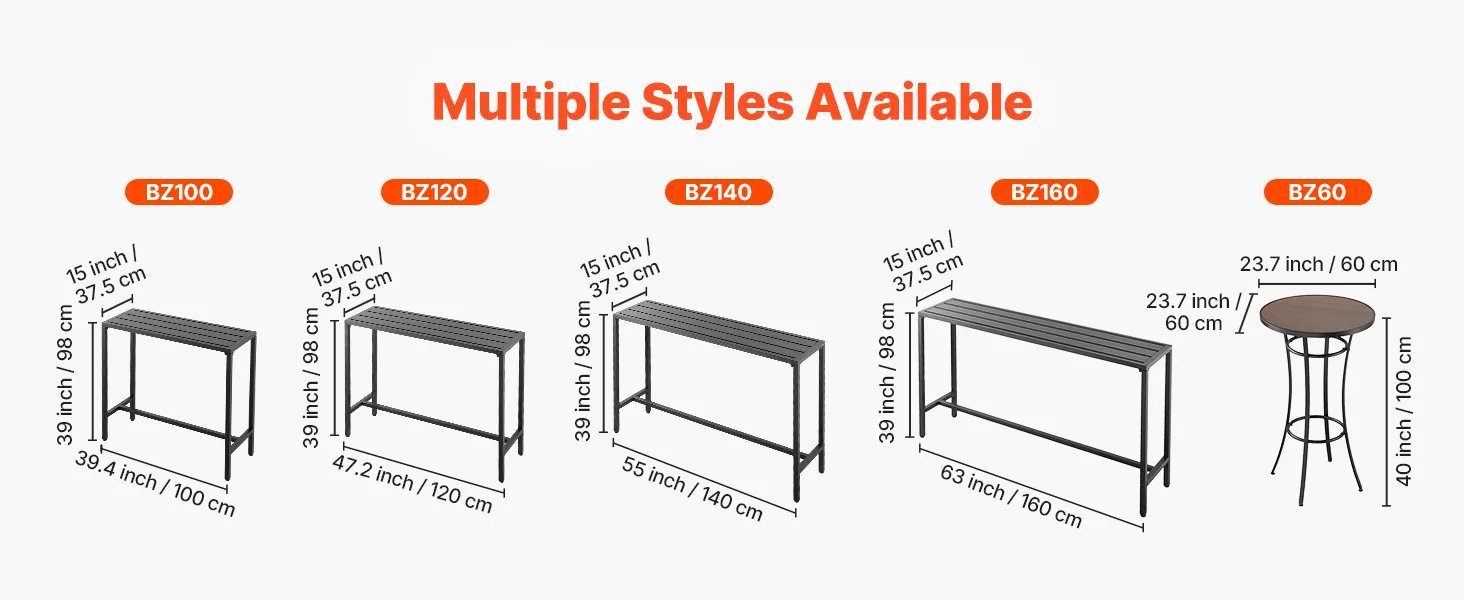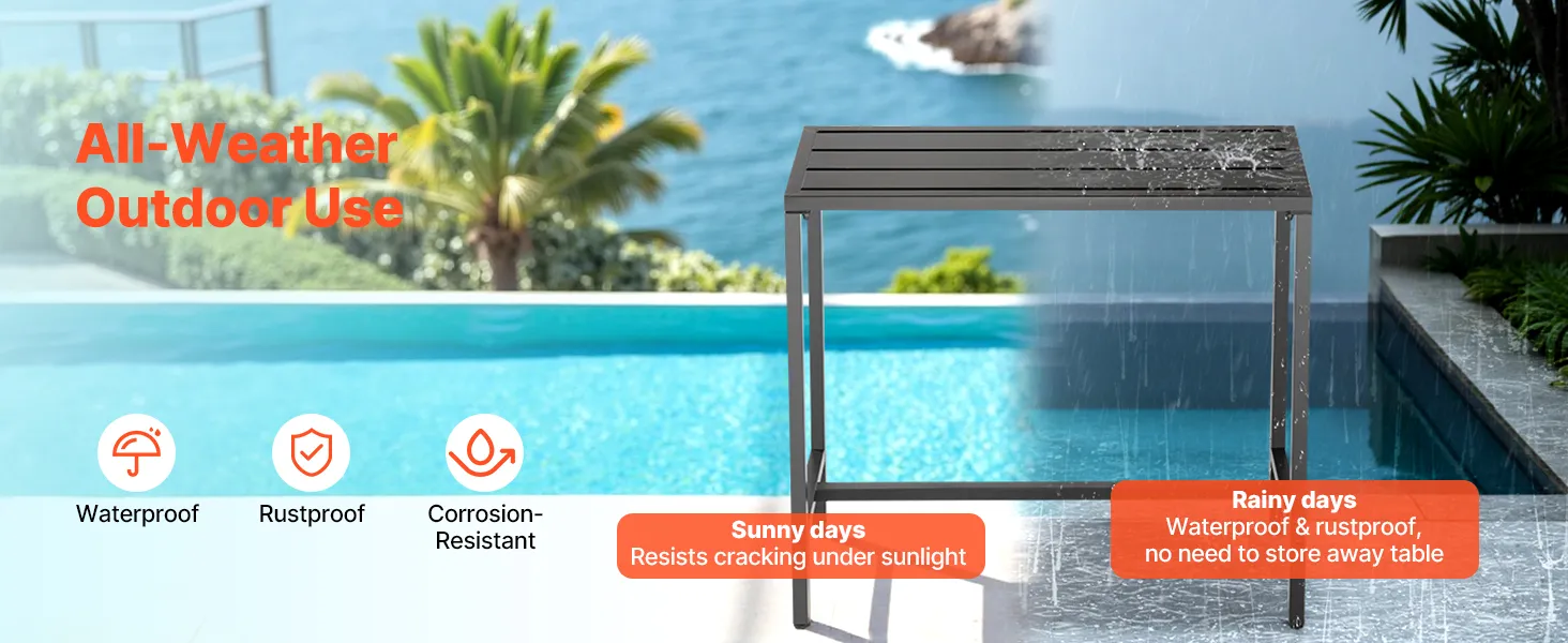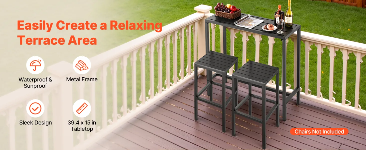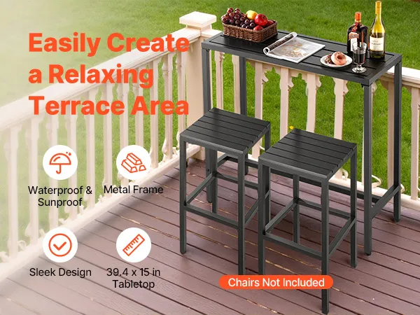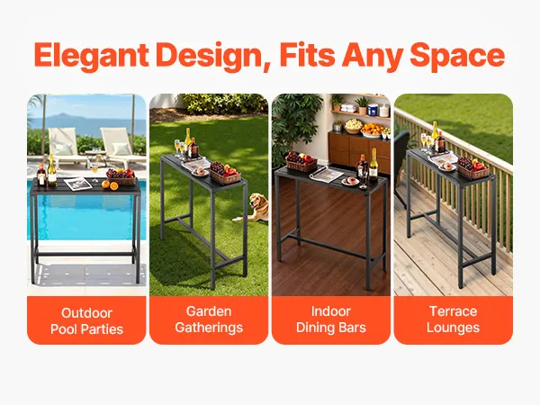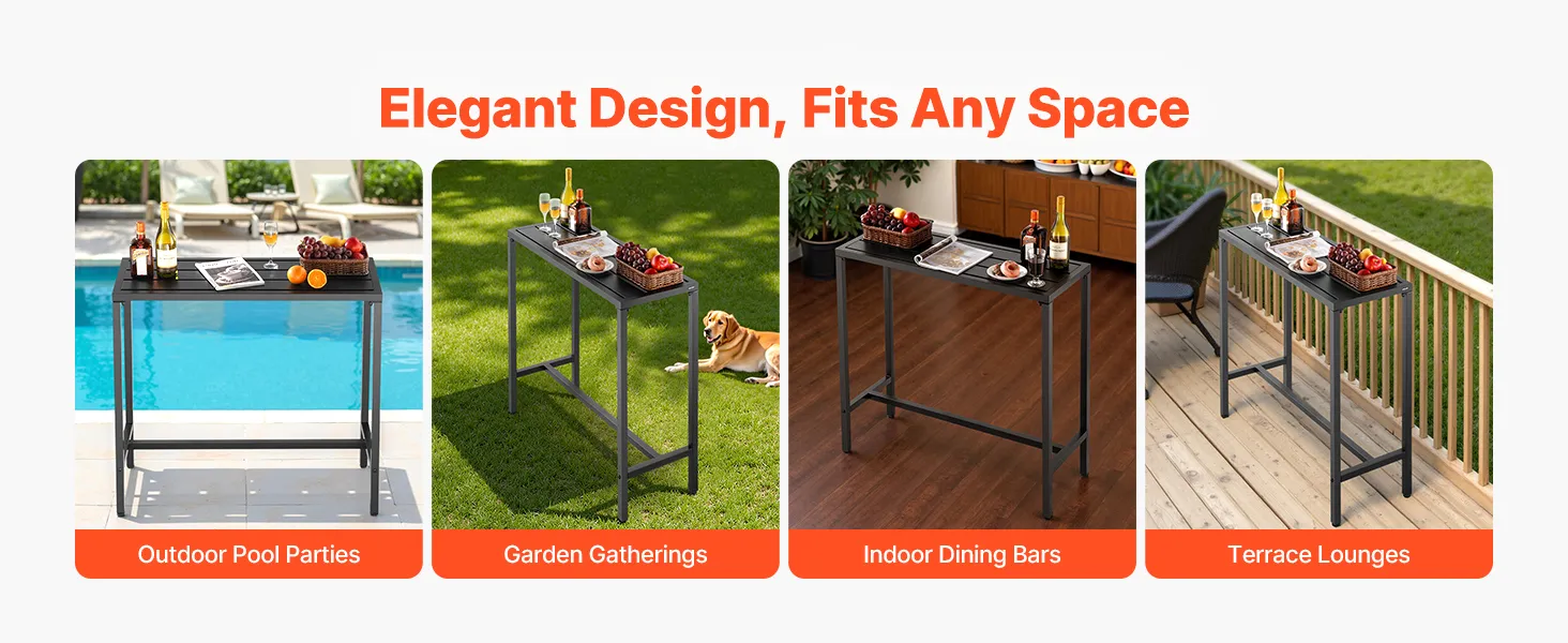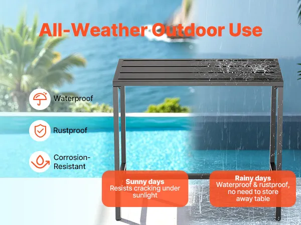 Unser 100 x 37,5 cm großer Terrassen-Bartisch verfügt über einen stabilen Metallrahmen und eine dicke, wasserfeste Tischplatte, die sich nicht verbiegt und verzieht. Ideal für Treffen am Pool, Gartenpartys im Freien oder Essbereiche im Innenbereich – ideal für gemütliche Zusammenkünfte oder Momente der Entspannung.