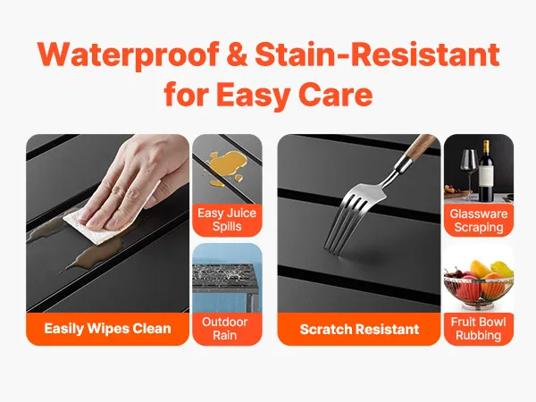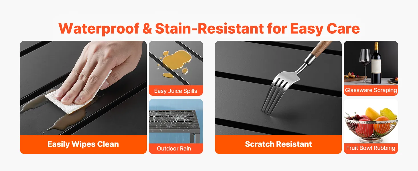 Wasserdichte Tischplatte: Der Esstisch verfügt über eine verzinkte Stahlplatte, die korrosions- und rostbeständig ist und ihn somit wasserdicht und kratzfest für den Außenbereich macht. Verschüttete Flüssigkeiten, Säfte oder Kratzer lassen sich leicht reinigen, wodurch das makellose Aussehen des Tisches erhalten bleibt.