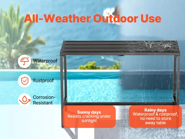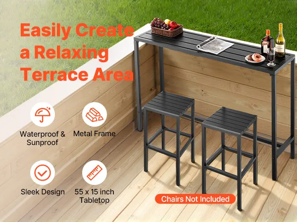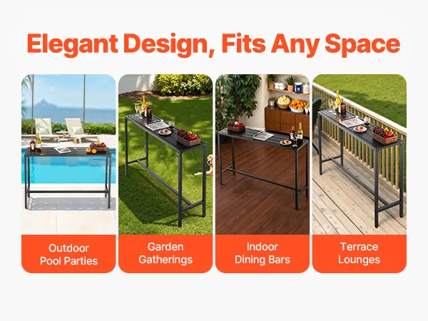 Unser 140 x 37,5 cm großer Terrassen-Bartisch verfügt über einen stabilen Metallrahmen und eine dicke, wasserfeste Tischplatte, die sich nicht verbiegt und verzieht. Ideal für Treffen am Pool, Gartenpartys im Freien oder Essbereiche im Innenbereich – ideal für gemütliche Zusammenkünfte oder Momente der Entspannung.
