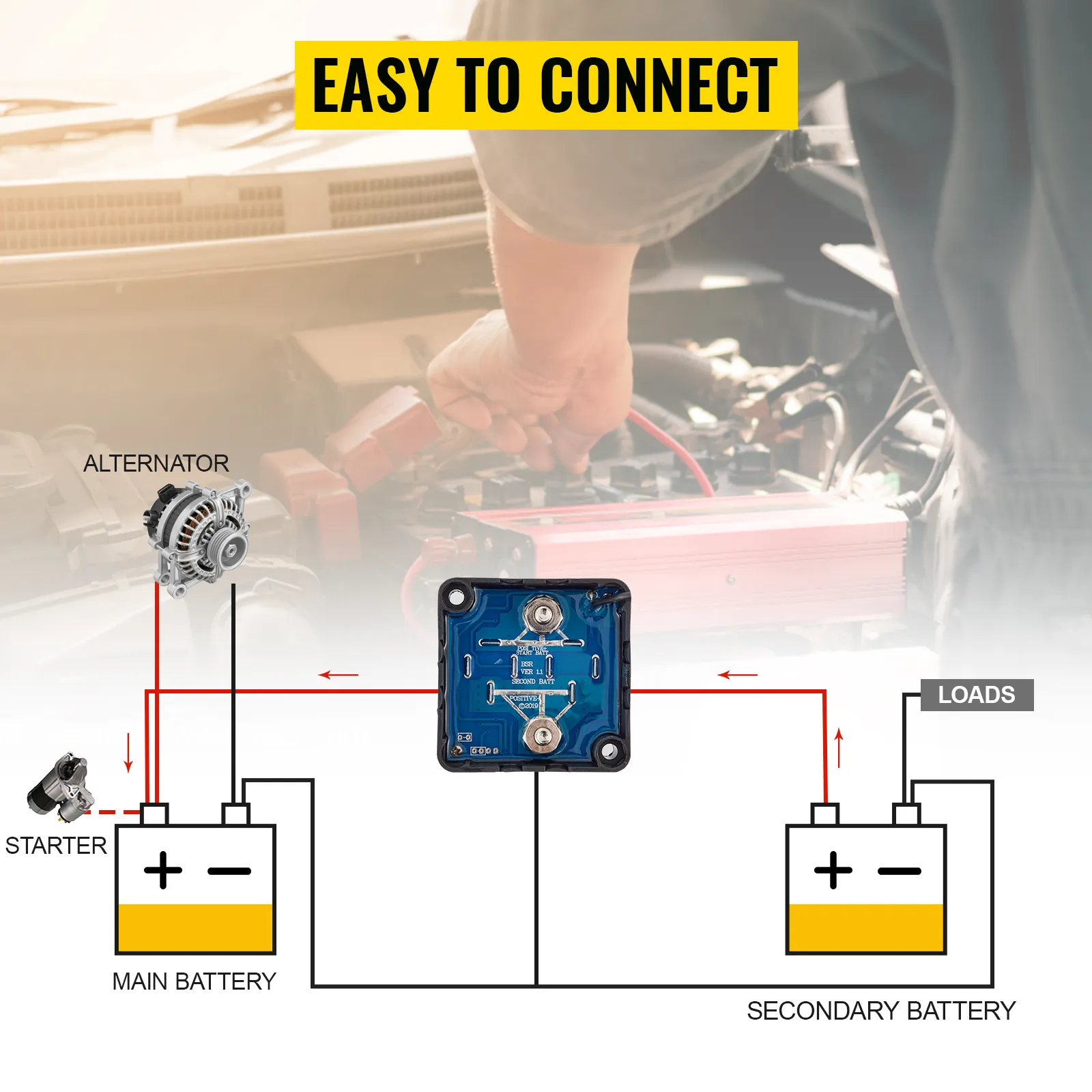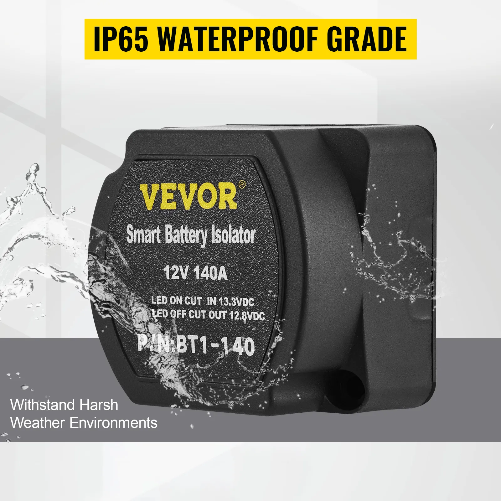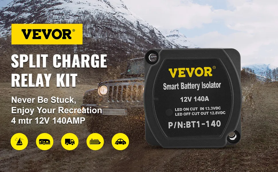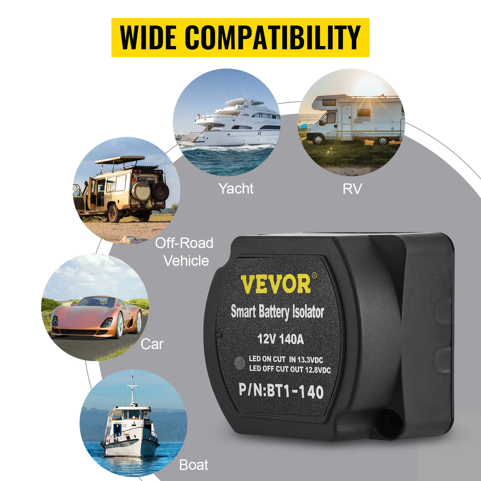 Der VEVOR spannungsempfindliches Relais (VSR) stellt sicher, dass Sie Ihr Fahrzeug mit zwei Batterien immer starten können. Für die Installation haben wir für Sie ein gesamtes Zubehör bereitgestellt, sodass Sie nach Erhalt des Pakets mit dem Einbau beginnen können. Für diverse Fahrzeugmodellen geeignet, zum Beispiel die miesten Automodellen, Wohnmobile, Lastwagen, Wohnwagen, Schiffe, Boote, Yachten usw. Überzeugen Sie sich selbst! VEVOR - mit uns immer startbereit.