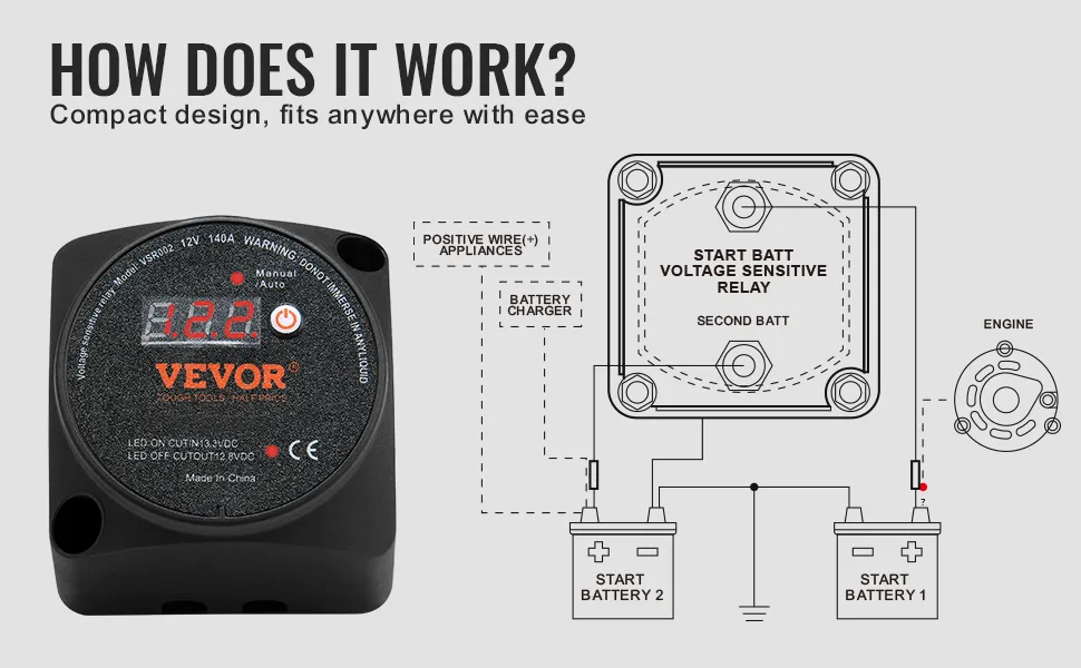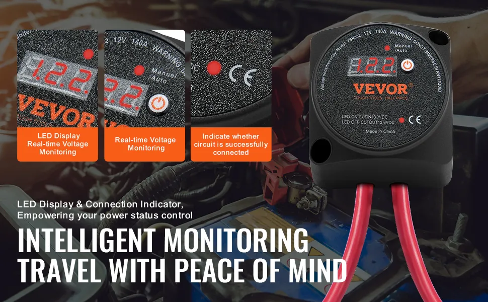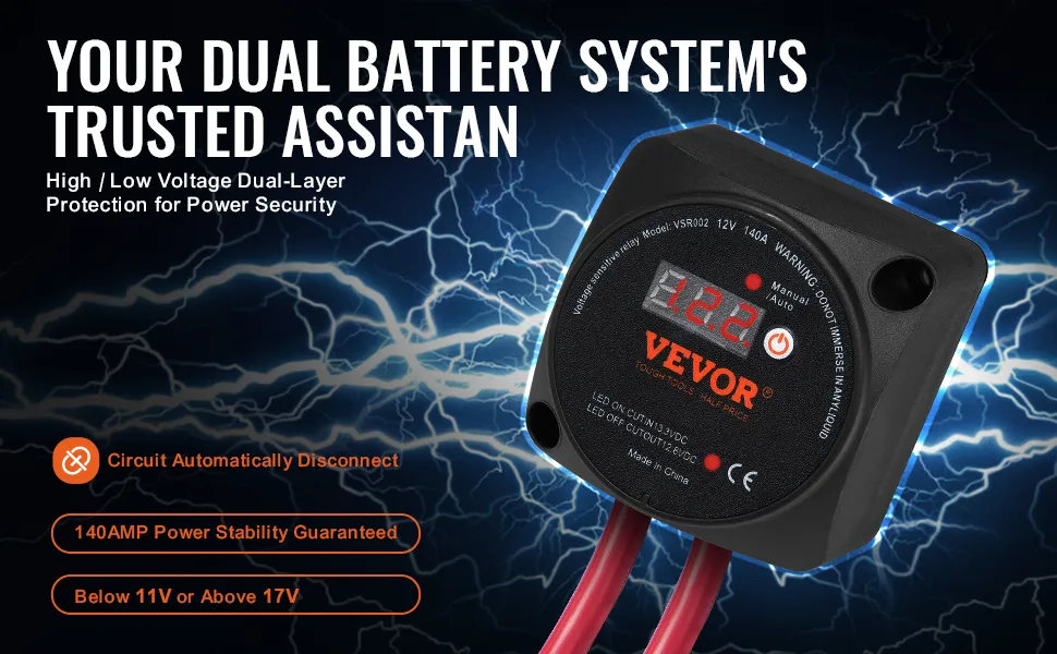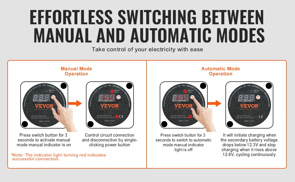 Dies ist ein nützliches Werkzeug für ein effektives Batteriemanagement. Die zwei Modi sorgen für Komfort und Effizienz Ihres Stromversorgungssystems. Sie können Ihre Batterien flexibel verwalten. Sie können je nach Bedarf zwischen den Modi wechseln. Ihre VEVOR-Technologie (Voltage Sensitive Relay) sorgt für effizientes Laden der Batterie. Sie erkennt und verwaltet den Ladevorgang automatisch. Dies trägt dazu bei, den optimalen Zustand der Batterie aufrechtzuerhalten. Im manuellen Modus haben Sie die volle Kontrolle über den Ladevorgang. Es ist also für verschiedene Szenarien geeignet.
