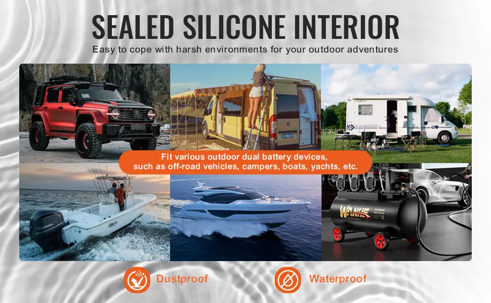 Das VEVOR-Doppelbatterie-Isolationskit sorgt für eine zuverlässige Stromversorgung aller Ihrer Geräte. Wenn Sie verhindern, dass Ihre Hauptbatterie entladen wird, während andere Geräte laufen, können Sie verhindern, dass Ihr Fahrzeug oder Boot liegen bleibt. So können Sie verhindern, dass Ihr Auto oder Ihre Yacht liegen bleibt. Sie können Ihre Lichter, Geräte und Ladegeräte mit Strom versorgen. Die integrierte Spannungsüberwachung sorgt für eine optimale Leistung. Sie müssen sich keine Sorgen machen, dass Ihnen auf längeren Fahrten der Strom ausgeht. Dieses Isolatorkit bietet Sicherheit für alle, die Strom benötigen, insbesondere für alle, die auf mehrere Batterien angewiesen sind. Unser Kit ist so konzipiert, dass es nahtlos mit verschiedenen Stromversorgungssystemen funktioniert. Es ist also eine zuverlässige Lösung, um sicherzustellen, dass Ihre Geräte aufgeladen bleiben. Für alle, die eine konstante Stromversorgung wünschen, sorgt dieses Gerät für Sicherheit.