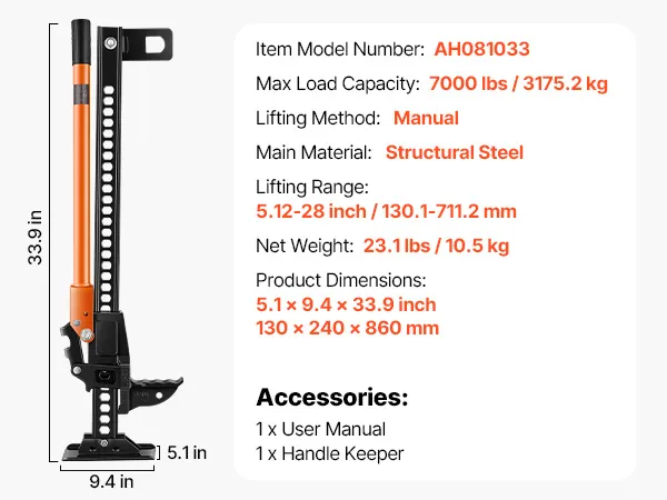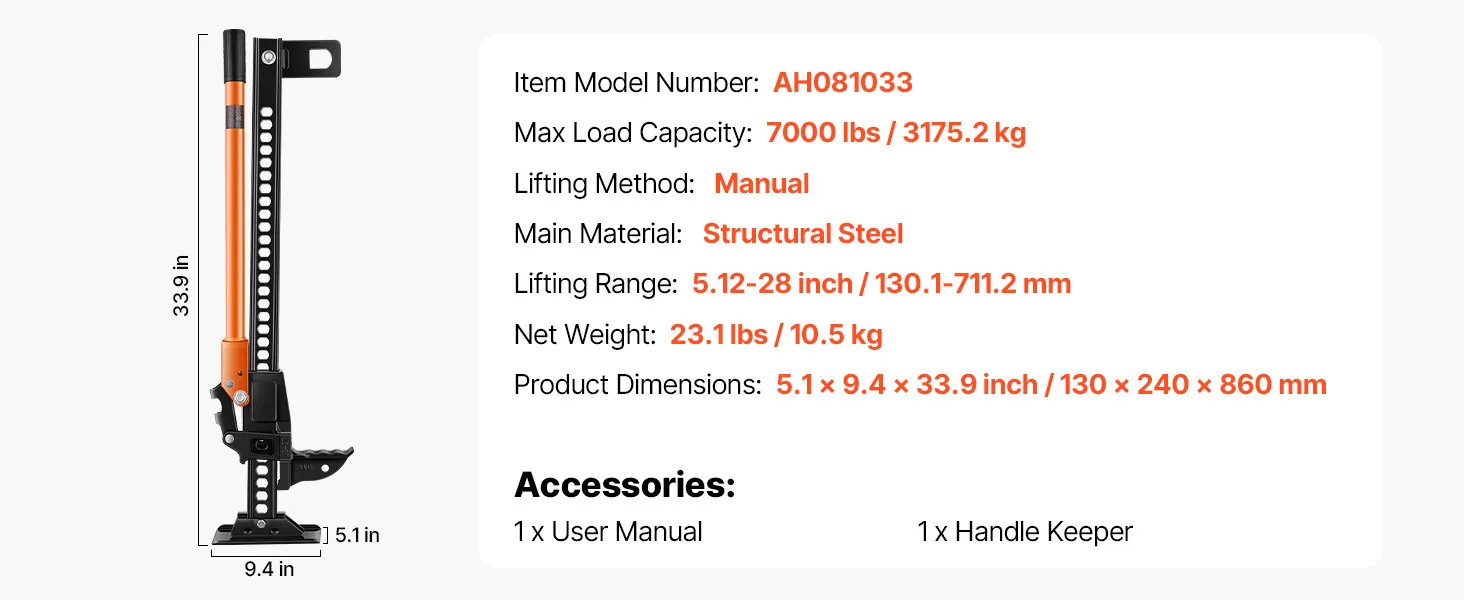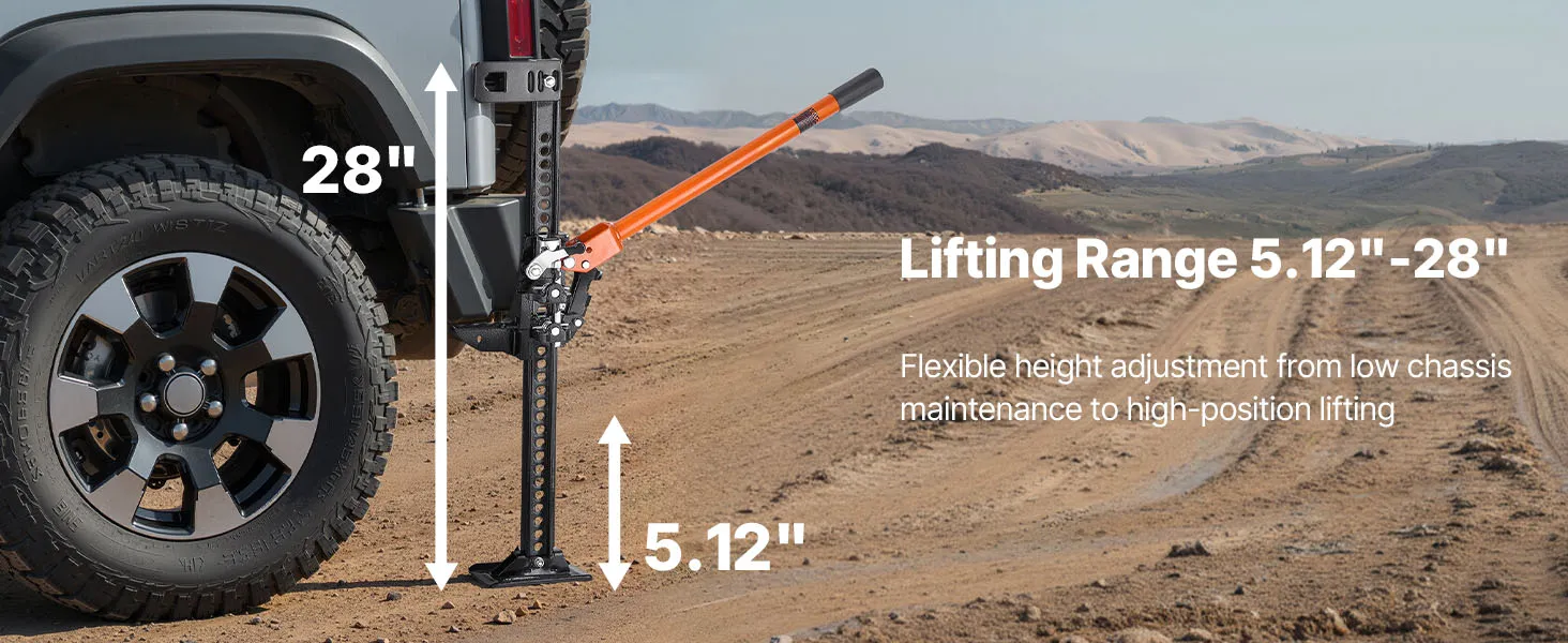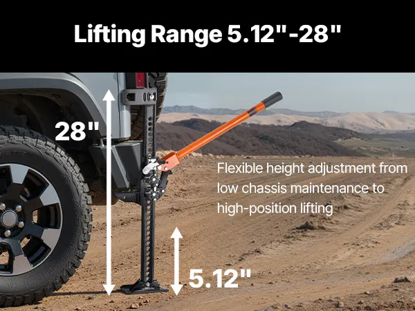 Der Hochhubwagenheber verfügt über einen Hubbereich von 130,1–711,2 mm und ist für Fahrzeuge mit niedrigem Fahrgestell oder Landmaschinen mit hoher Bodenfreiheit geeignet. Die manuelle Hubkonstruktion benötigt keinen Strom und ermöglicht eine präzise Höhenkontrolle auch auf dem Feld.