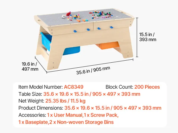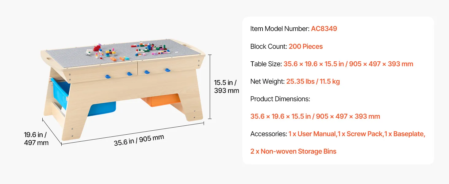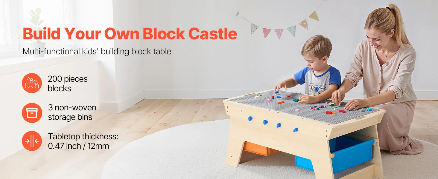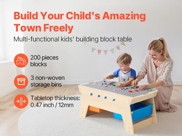 VEVOR Kindertisch 905 x 497 x 393 mm, Aktivitätstisch aus Holz, Mehrzweck-Spieltisch mit 200 Bausteinen und 3 Aufbewahrungsbehältern, Bausteintisch, Geschenk für Kinder ab 3 Jahren, Holzfarbe