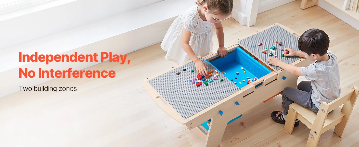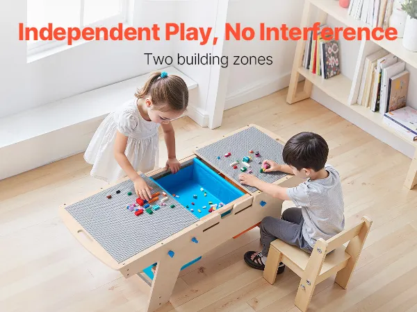 Einfach zu bedienen: Der Kinder-Bauspieltisch verfügt über leicht zu ziehende Griffe, die ihn in zwei separate Spielbereiche verwandeln. Kinder können alleine oder gemeinsam spielen, während die kindersicheren Scharniere für Sicherheit während des gesamten Spiels sorgen.