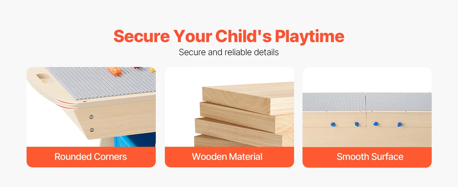 Der Kleinkindspieltisch hat abgerundete Ecken, damit Ihr Kleines sicher sitzt. Der robuste Tisch ist langlebig und die polierte Holzoberfläche ist glatt und schützt vor Splittern und Kratzern. Eltern können sich entspannen, denn der Tisch ist sicher.