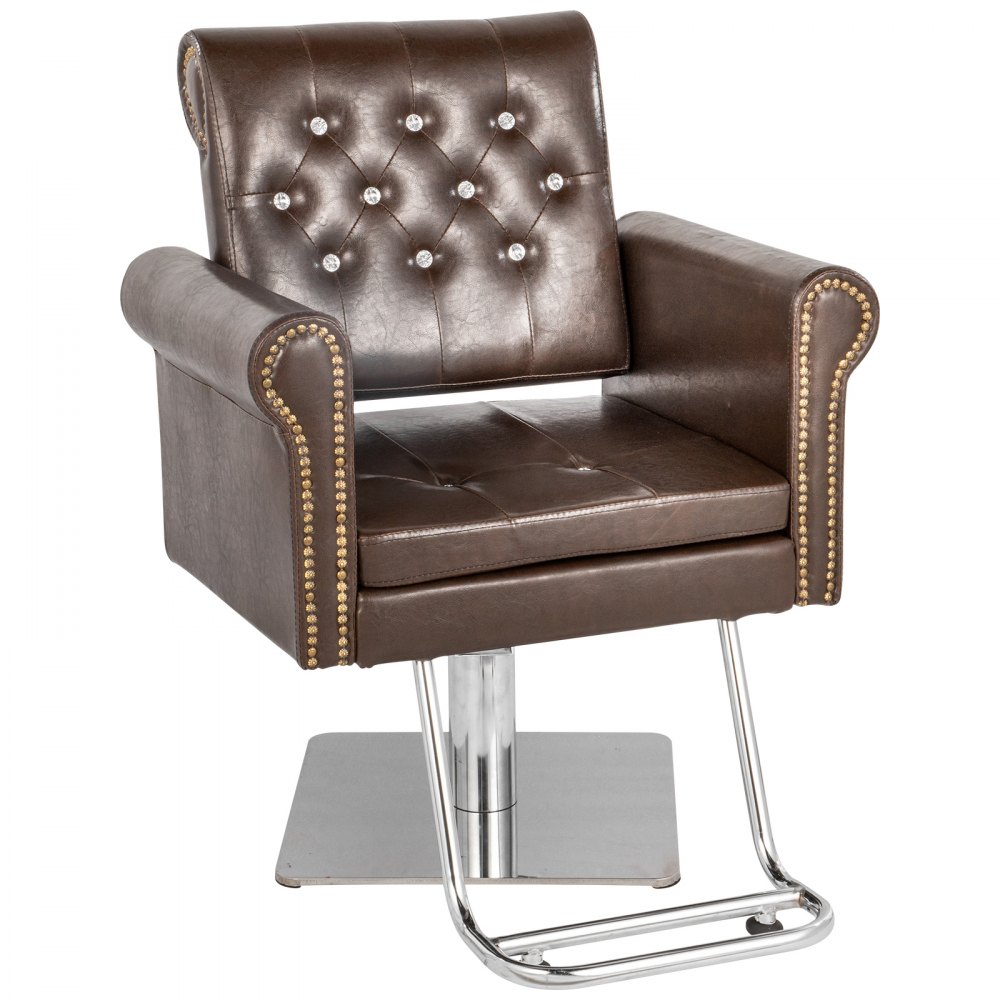 Dieser Friseurstuhl hat ein klassisches Aussehen und eine klassische Farbe. Es ist jedoch recht modern mit glänzenden Polsterperlen und Bronzeknöpfen.