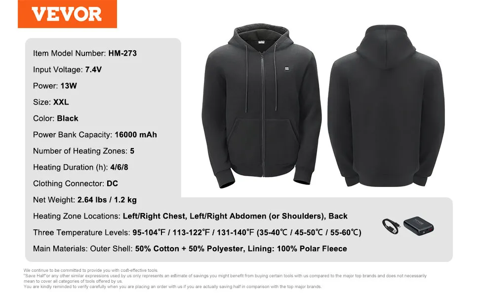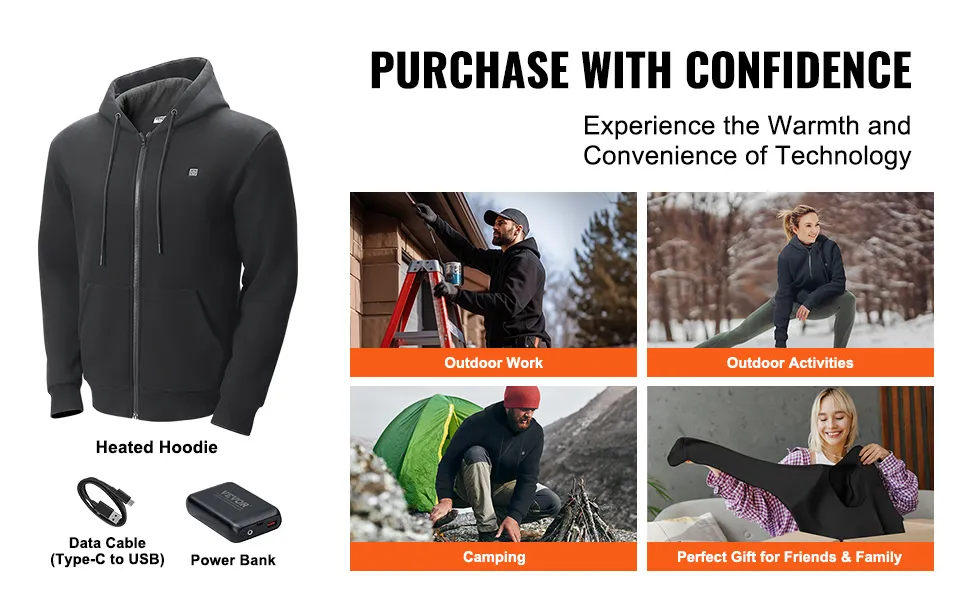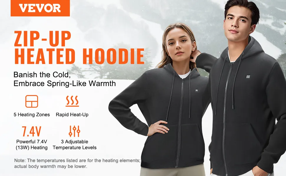 VEVOR Beheizter Kapuzenpullover, Unisex Beheiztes Sweatshirt mit Akkupack 7,4 V, Elektrische Jacke mit Reißverschluss und 5 Heizzonen für Männer und Frauen, Leichter warmer beheizter Outdoor-Pullover für Camping, XXL-Größe Schwarz