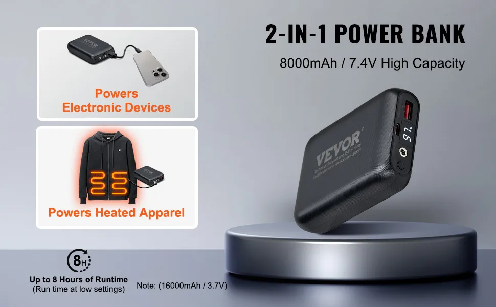 Langanhaltende Wärme: Ausgestattet mit einem Hochleistungsakku mit einer Kapazität von bis zu 8000 mAh / 7,4 V (16000 mAh / 3,7 V) sorgt er dafür, dass das Sweatshirt im Heizmodus mit hoher Intensität 3-4 Stunden, im Modus mit mittlerer Intensität 5-6 Stunden und im Heizmodus mit niedrigster Intensität 7-8 Stunden lang funktioniert und dem Benutzer so einen lang anhaltenden Wärmeschutz bietet. Der Akku in diesem Sweatshirt kann nicht nur das Kleidungsstück selbst mit Strom versorgen, sondern auch kleine elektronische Geräte im Notfall aufladen