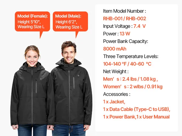 Verfügt über fünf Kohlefaser-Heizzonen (Arme, Bauch, Rücken) mit drei Heizstufen bis zu 60 °C. Betrieben mit einem 7,4-V-Akku mit 8000 mAh für 6–10 Stunden Wärme. Das wasserabweisende Material eignet sich zum Wandern, Camping, Skifahren, Angeln und Jagen.