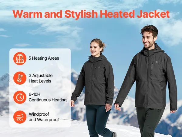 Winddicht & Wasserdicht: Dieser beheizte Mantel besteht aus hochdichtem, wasserdichtem Gewebe mit warmem, atmungsaktivem Futter. Verstellbare Bündchen, Kapuze und Saum halten Wind und Schnee ab und sorgen für Komfort bei rauem Winterwetter.