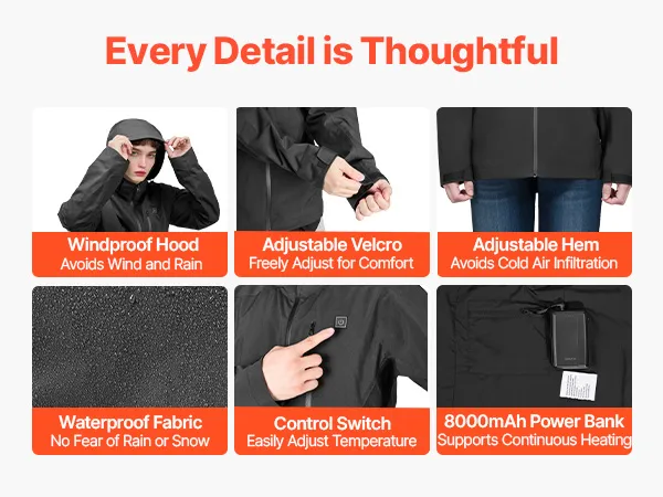 Verstellbare Kapuze, Bündchen und Saum bieten Windschutz, während eine einfache Ein-Knopf-Steuerung und ein 8000-mAh-Akku diese per USB beheizte Jacke perfekt für den täglichen Gebrauch machen.
