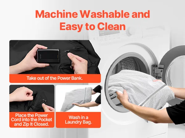 Diese beheizte Arbeitsjacke aus hochdichtem, strapazierfähigem Stoff ist maschinenwaschbar. Einfach die Batterie herausnehmen, das Kabel befestigen und in die Waschmaschine werfen.