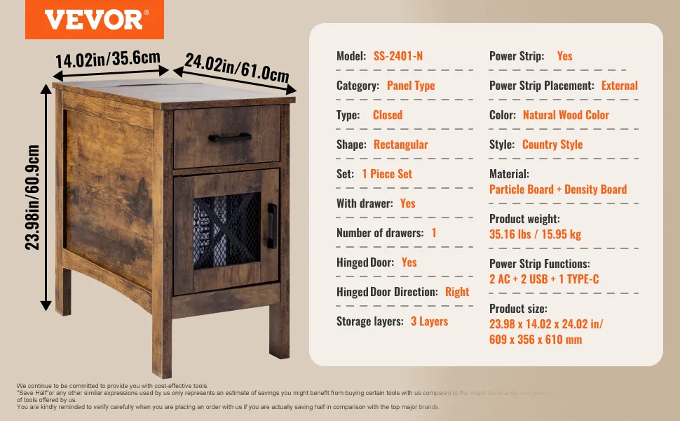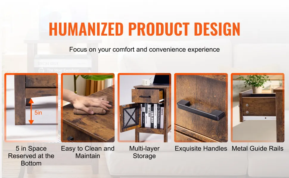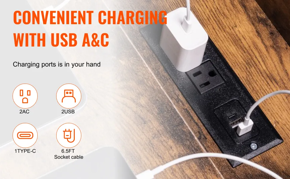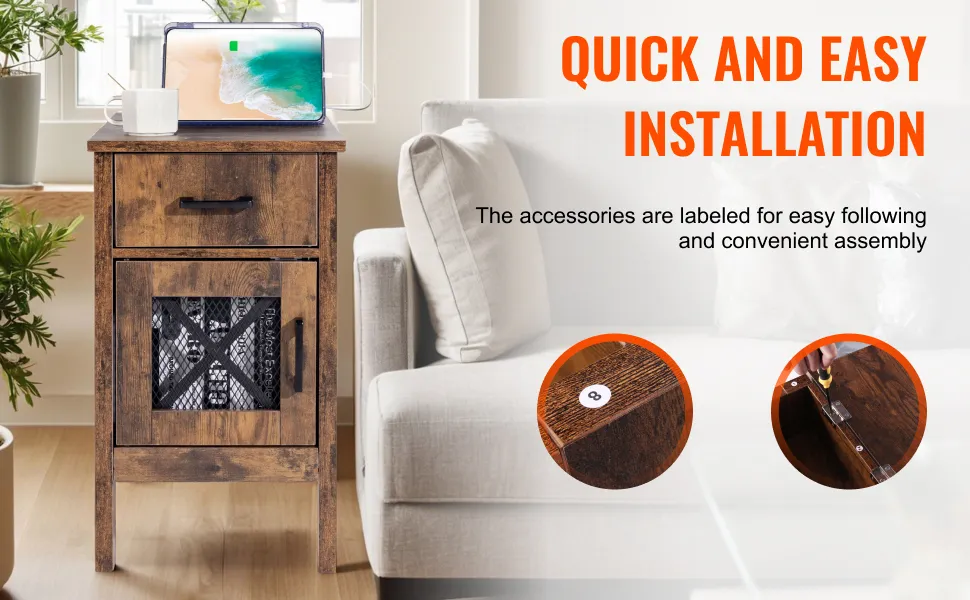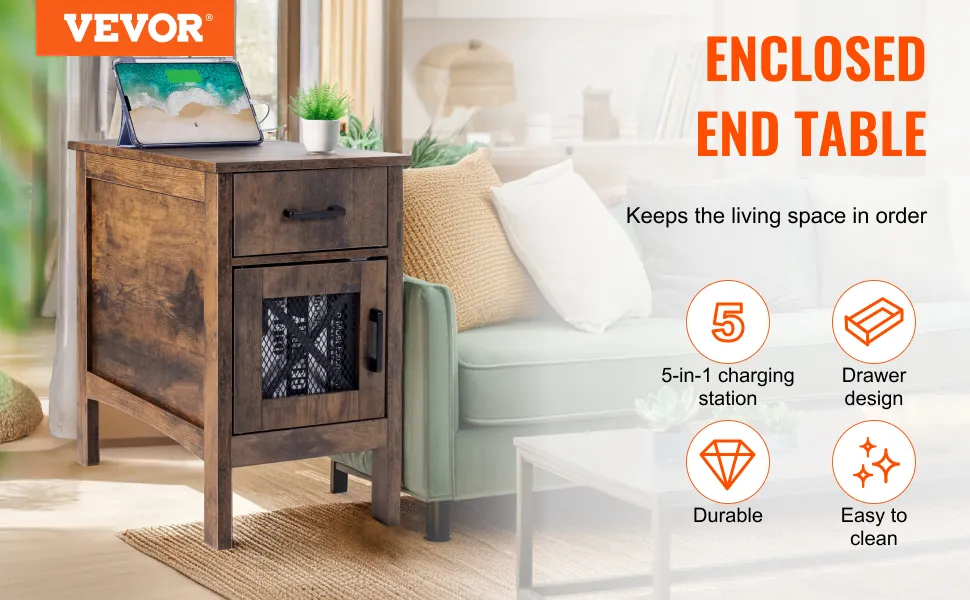 Praktische Ladestation: Der VEVOR-Beistelltisch im Landhausstil verfügt über ein 5-in-1-Design mit integrierter Steckdose für mehrere elektronische Geräte. Halten Sie Ihre Geräte und Lampen in Reichweite, ohne nach Ladeanschlüssen suchen zu müssen. Darüber hinaus können Sie dank der Kabellänge von 6,5 Fuß (2 m) bequem von Steckdosen entfernt bleiben.