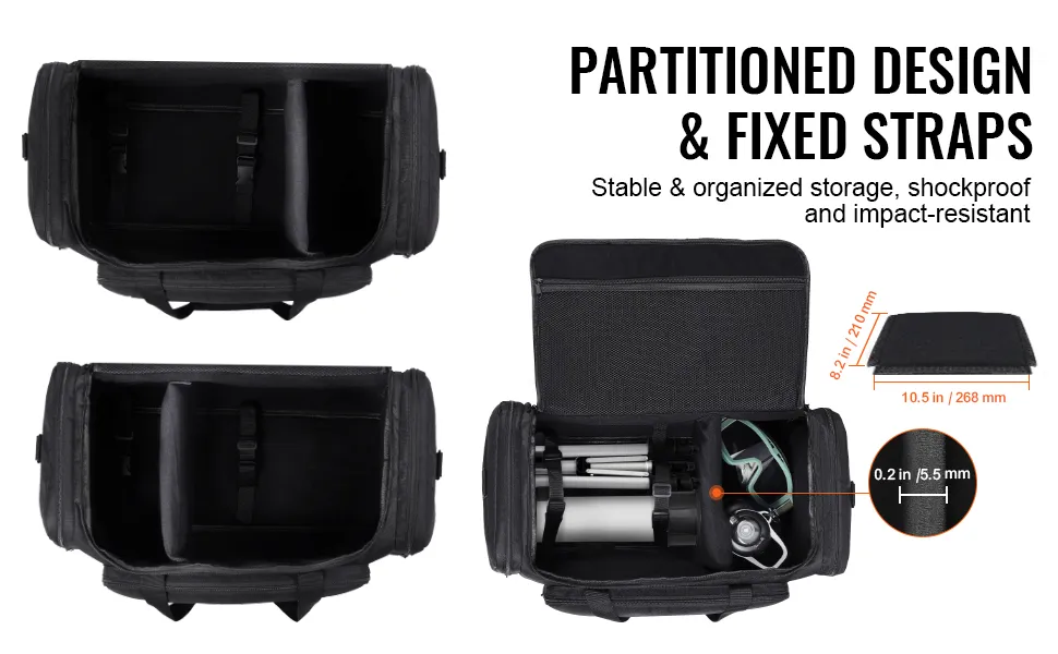 Vielseitige Aufbewahrungsmöglichkeiten: Die 0,2 Zoll/5,5 mm dicke, abnehmbare Trennwand erleichtert nicht nur die Raumanpassung und optimiert die Aufbewahrungseffizienz, sondern verbessert auch die innere Polsterung erheblich. Die Teleskophülle kann Stöße und Druck von außen wirksam abwehren und schützt das Teleskop und sein Zubehör in jeder Hinsicht.
