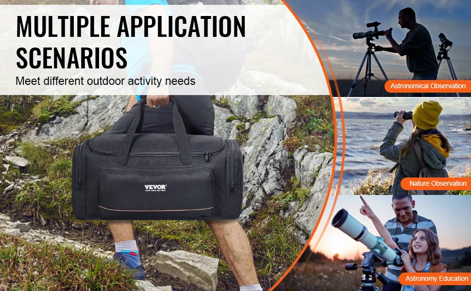 Unterteilung in mehrere Taschen: Die Teleskoptasche ist sorgfältig mit drei Außentaschen und einer inneren Netztasche ausgestattet, sodass Sie Ihre Ladekabel, Taschenlampen, Laptops und andere kleine Gegenstände und Werkzeuge ordentlich verstauen können, was das Reisen und Beobachten komfortabler macht.