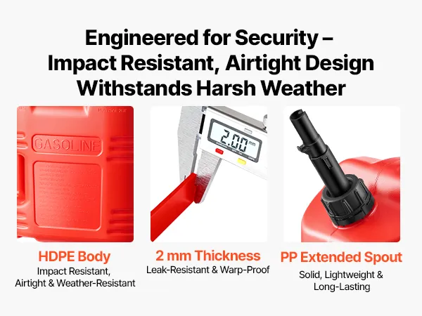 Dieser tragbare Kraftstoffbehälter besteht aus dickem HDPE mit 2 mm Wandstärke für Stabilität und Langlebigkeit. Er verfügt über einen auslaufsicheren Deckel und einen PP-Ausguss für eine gleichmäßige Ausgießrate von 15 L/min. Ideal für Autos, Motorräder, Offroad-Touren und den Einsatz im Freien.