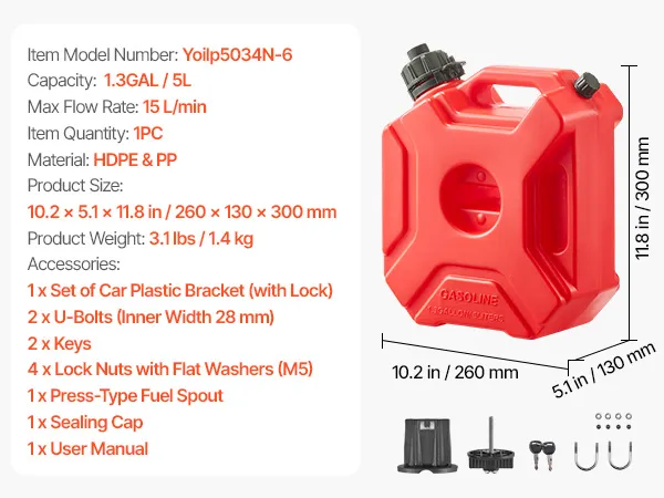 Dieser tragbare 5-Liter-Kraftstoffbehälter besteht aus dickem HDPE mit 2 mm Wandstärke für Stabilität und Langlebigkeit. Er verfügt über einen auslaufsicheren Deckel, eine Schnalle mit Lockerungsschutz und einen PP-Ausguss für eine gleichmäßige Ausgießrate von 15 L/min. Dank Diebstahlsicherung ist er ideal für Autos, Motorräder, Offroad-Touren und den Einsatz im Freien.