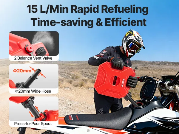 • Gleichmäßiger, schneller Durchfluss von 15 L/min: Sie hassen dieses „Gluck-Gluck“-Geräusch? Wir auch! Dieser tragbare Kraftstofftank mit breitem Schlauch und Doppelentlüftungssystem ermöglicht schnelles, gleichmäßiges Tanken und ermöglicht so eine Durchflussmenge von bis zu 15 L/min.