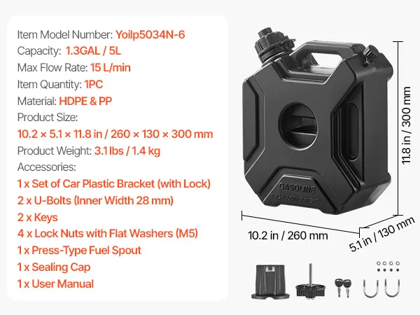 Dieser tragbare 5-Liter-Kraftstoffbehälter besteht aus dickem HDPE mit 2 mm Wandstärke für Stabilität und Langlebigkeit. Er verfügt über einen auslaufsicheren Deckel, eine Schnalle mit Lockerungsschutz und einen PP-Ausguss für eine gleichmäßige Ausgießrate von 15 L/min. Dank Diebstahlsicherung ist er ideal für Autos, Motorräder, Offroad-Touren und den Einsatz im Freien.