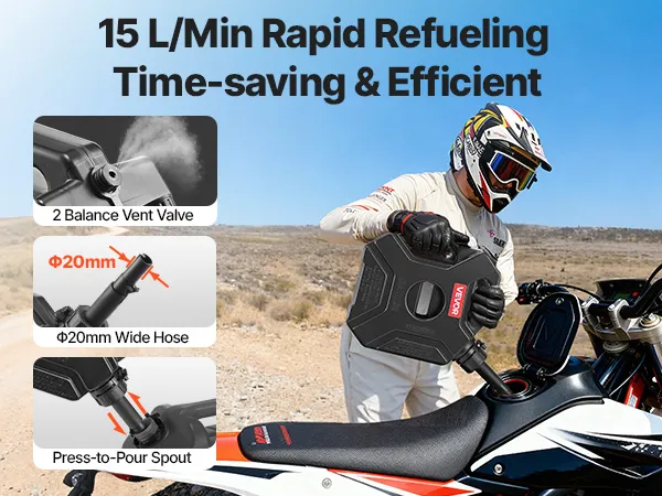 Gleichmäßiger, schneller Durchfluss von 15 L/min: Sie hassen dieses „Gluck-Gluck“-Geräusch? Wir auch! Dieser tragbare Kraftstofftank mit breitem Schlauch und Doppelentlüftungssystem ermöglicht schnelles, gleichmäßiges Tanken und ermöglicht so eine Durchflussmenge von bis zu 15 L/min.