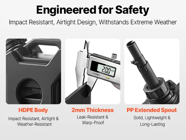 Langlebiges Design: Suchen Sie etwas Robustes? Dieser Benzinkanister aus dickem HDPE mit 2 mm Wandstärke trotzt Stürzen, Stößen und Sonne. Der PP-Ausguss macht das Ausgießen sauberer und einfacher