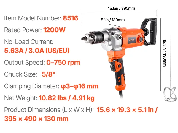 VEVOR elektrische Bohrmaschine 15,89 mm 1200 W mit Mixer Bohrmaschinenmischer Set 750 U/min 3,2 A Mischbohrmaschine mit D-Griff zum Bohren & Mischen Handbetonmischer für Futter Zement