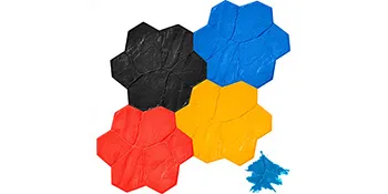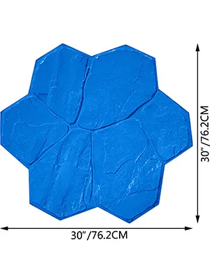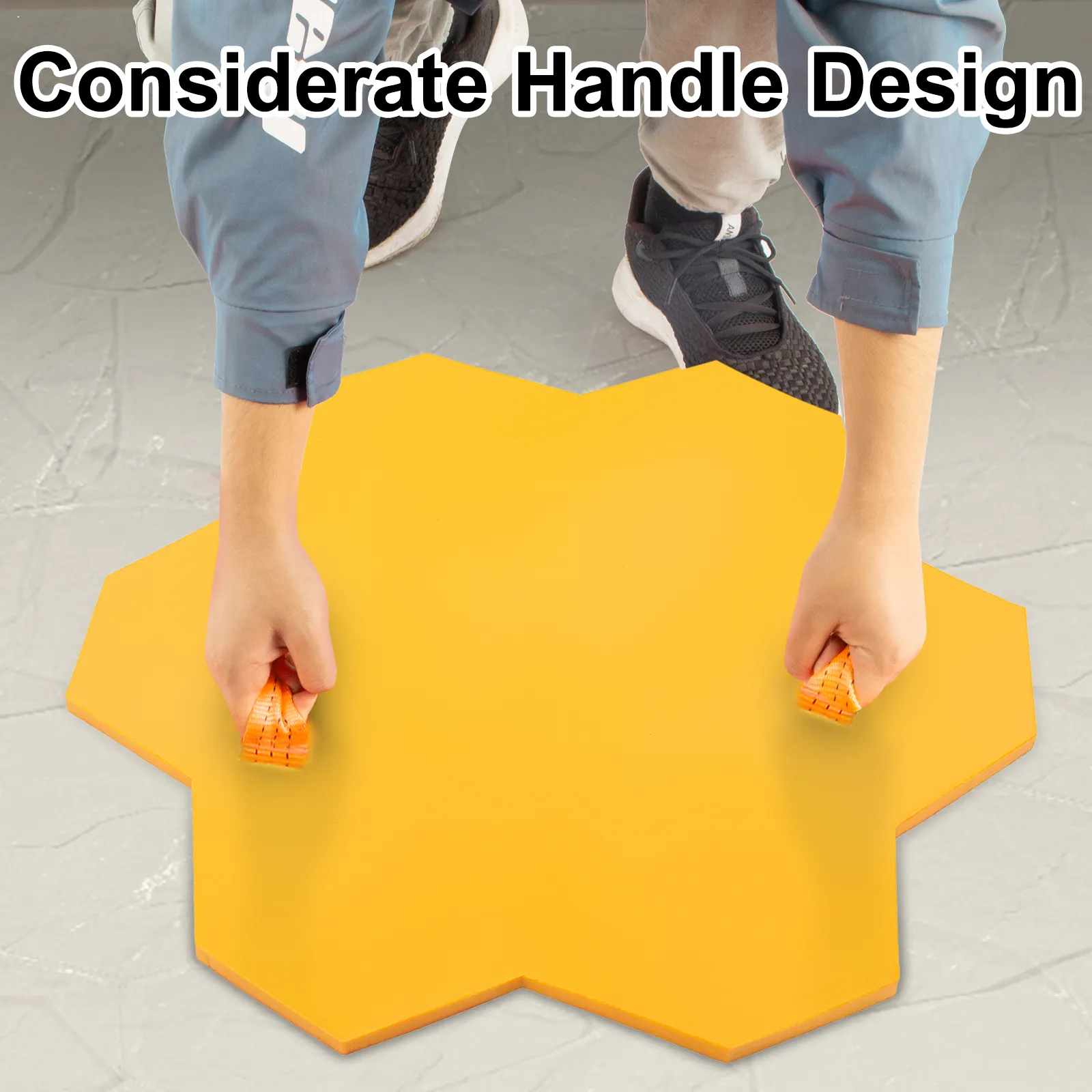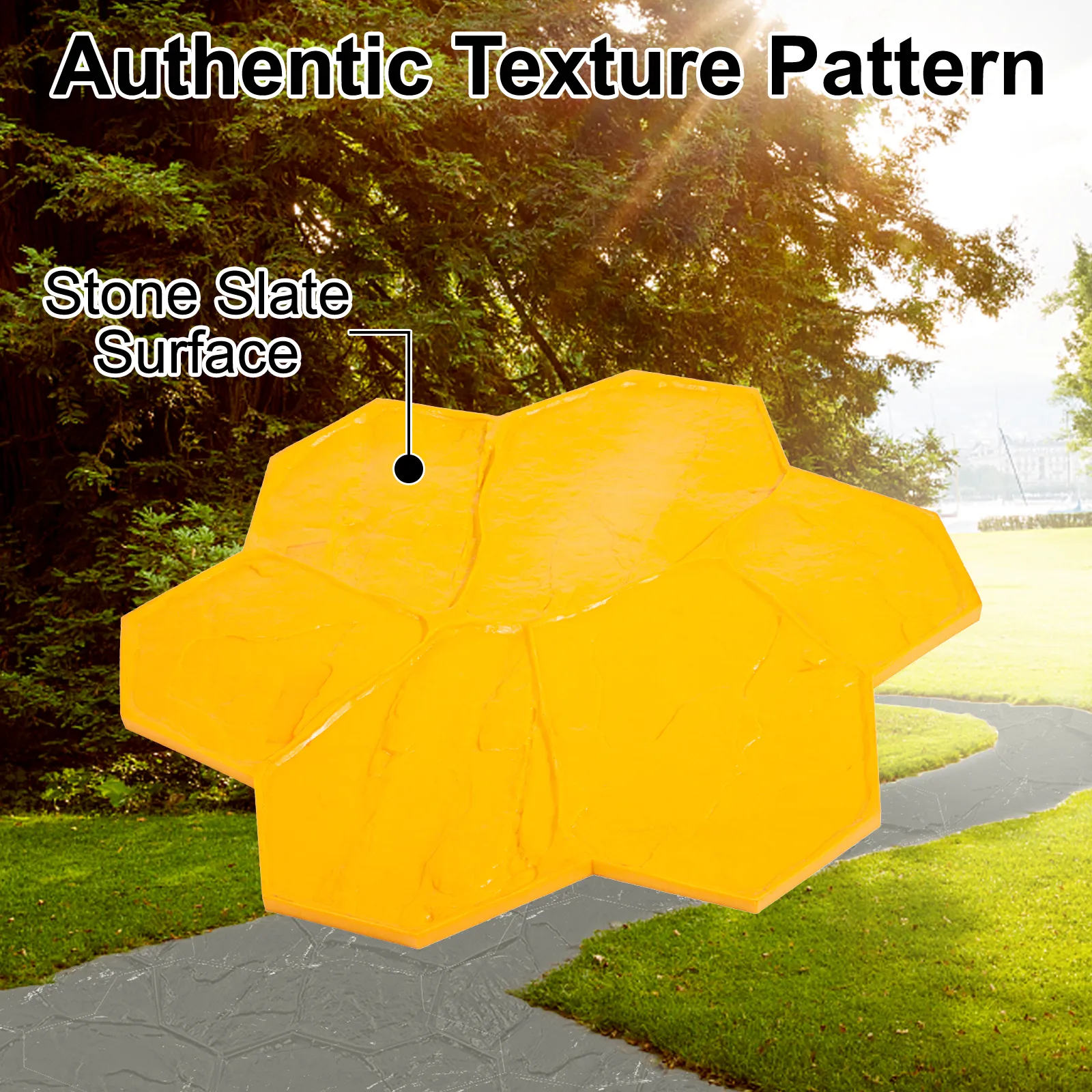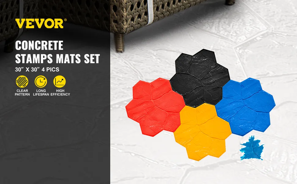 4 bunte Steinstempelmatten in einzigartigen quadratischen Formen, 1 blau, 1 rot, 1 gelb und 1 schwarz, haben jeweils eine Größe von 30 x 30 Zoll. Sie können sich in verschiedenen Ausrichtungen überlappen und kleine und große Flächen mit hoher Effizienz bewältigen.