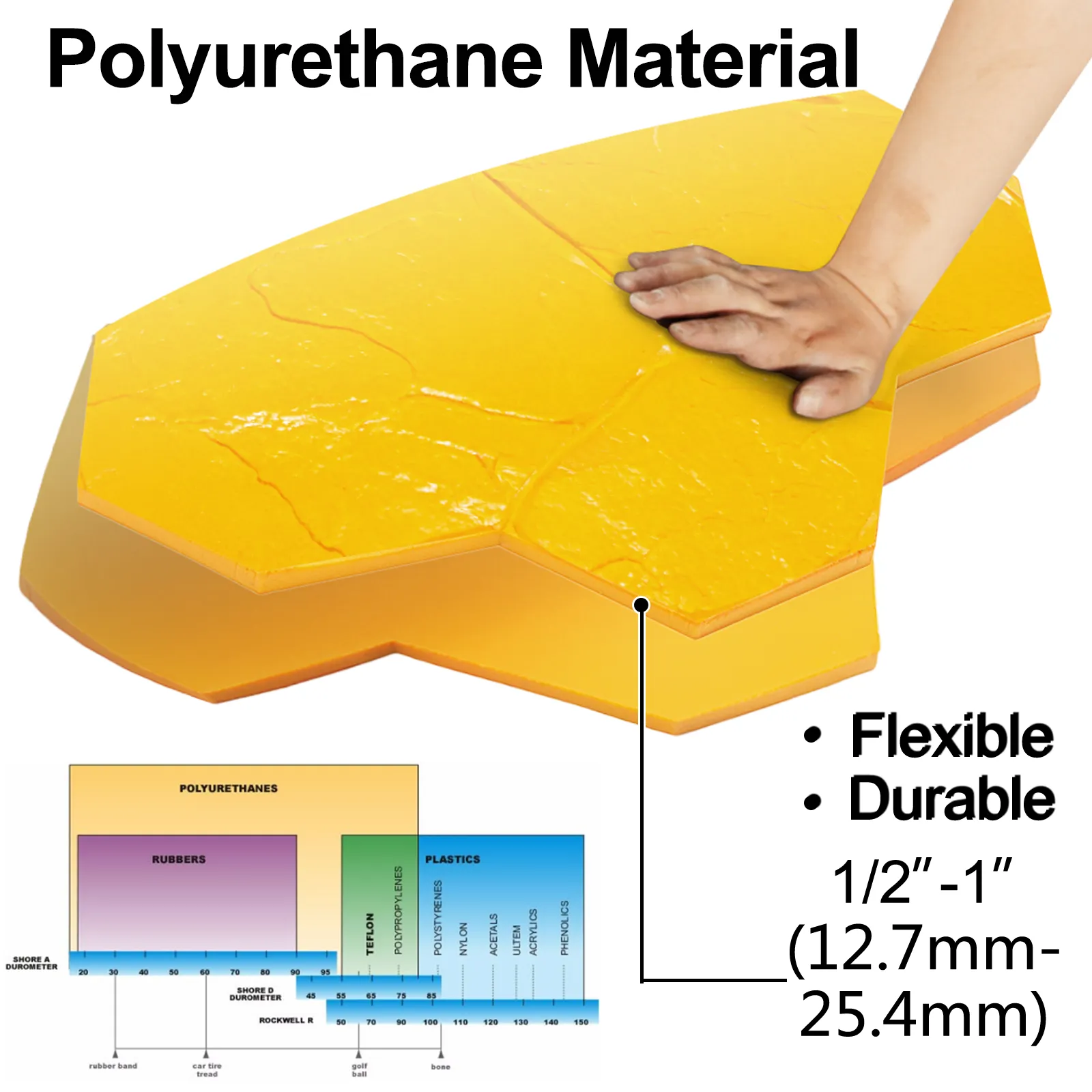 Die Steinstempel aus Beton bestehen aus Polyurethan mit einer Dicke von 12 - 25 mm und weisen außergewöhnliche Eigenschaften in Bezug auf Zugfestigkeit, Dehnung und chemische Beständigkeit auf. Sie sind langlebig und flexibel beim Bedrucken von Beton.