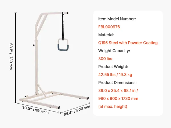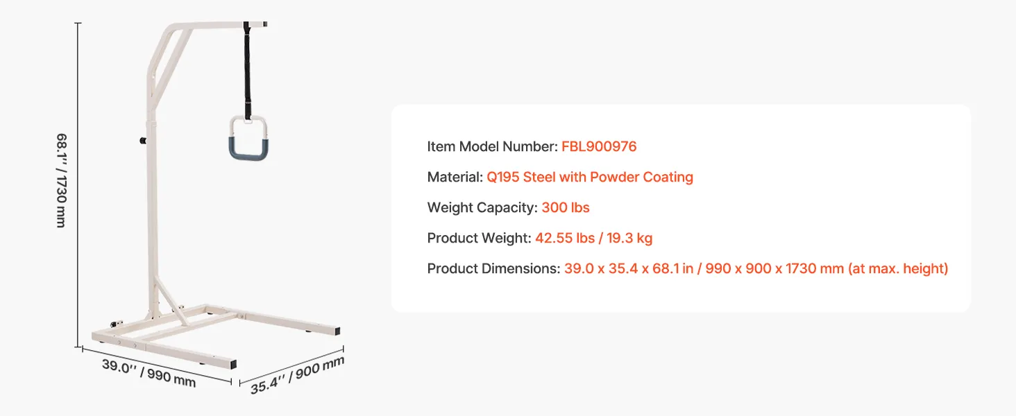 VEVOR Bettgalgen 990x900x1730 mm, höhenverstellbarer Krankenaufrichter, Bettaufrichter bis 136 kg, Aufstehhhilfe für ältere oder bettlägerige Menschen, für Krankenhaus, Pflegeheim & häusliche Pflege